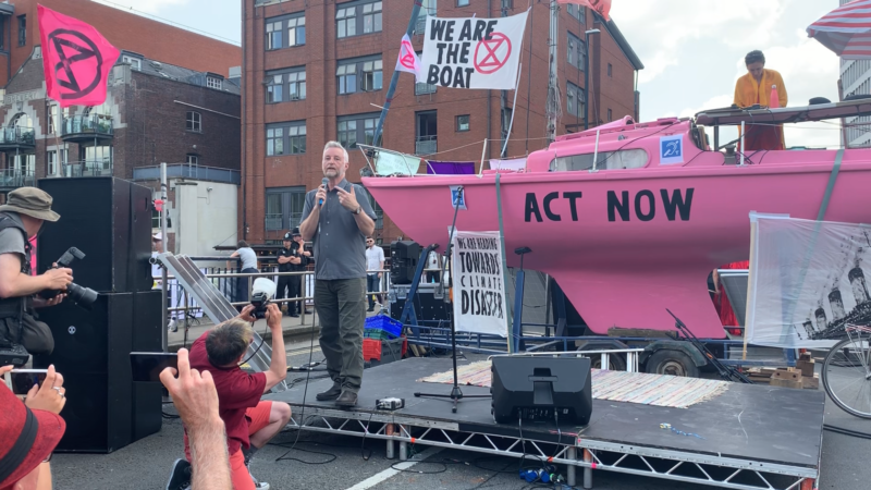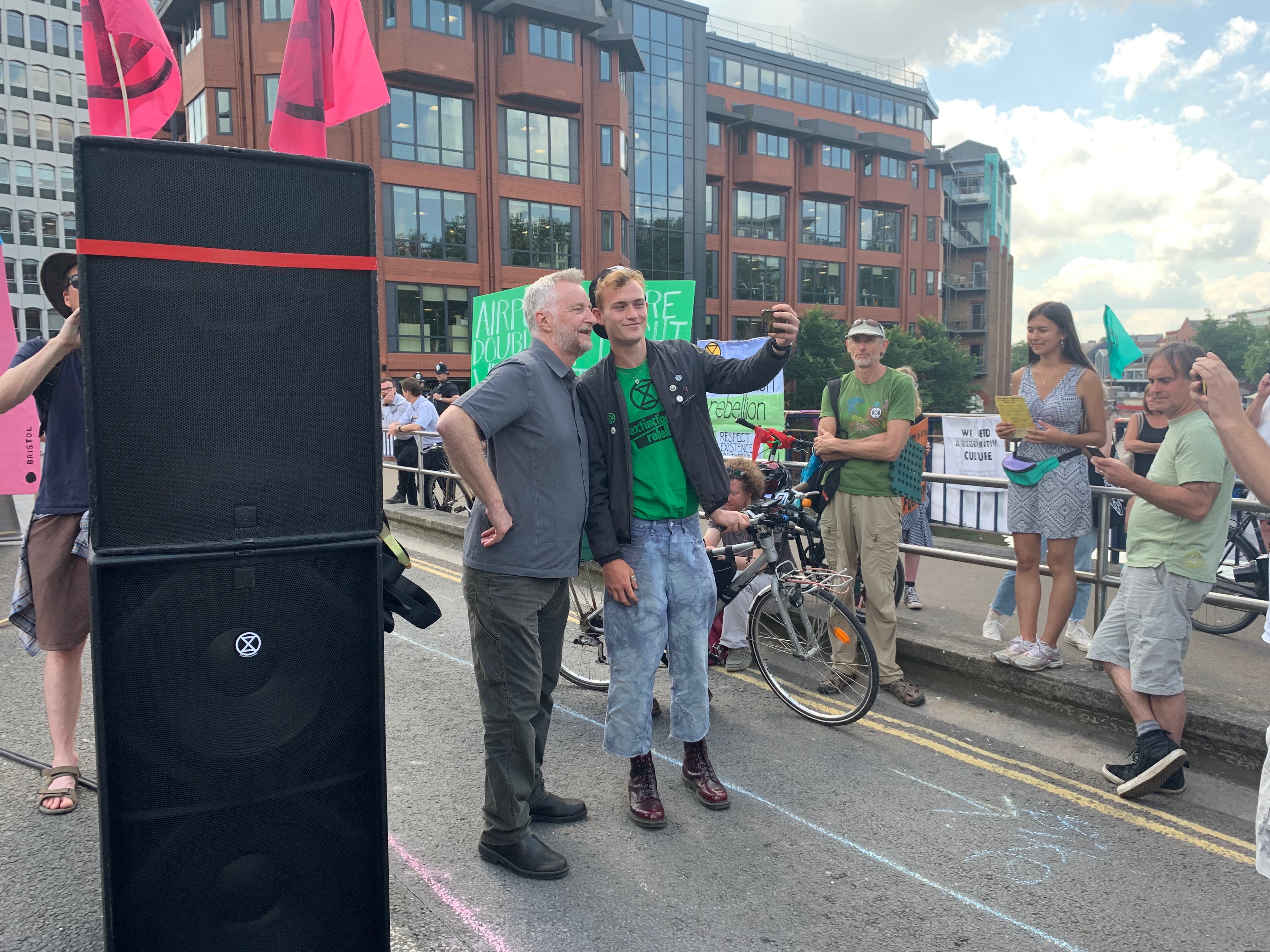 The singer-songwriter and activist gave a speech in front of the rebels’ pink ship on Bristol Bridge soon after midday, before the protestors took part in a procession to College Green, where he played several songs.