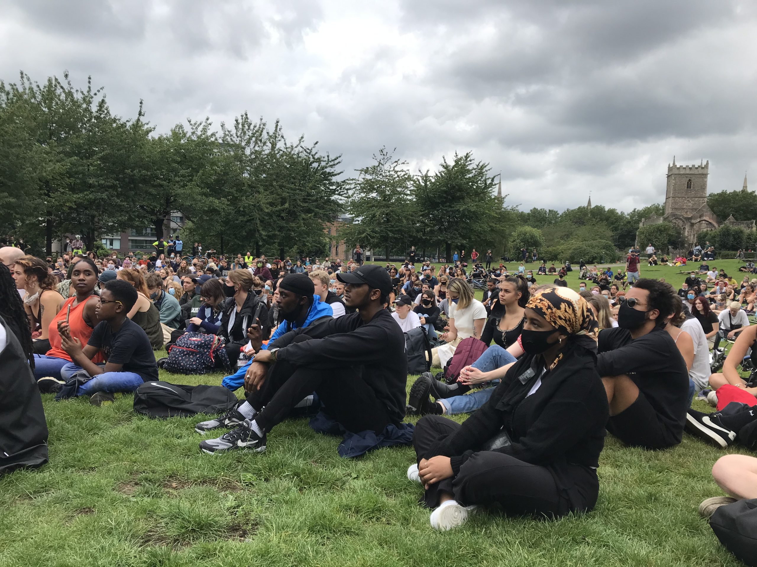 The march started in College Green and passed the slave trader’s former plinth before heading into Broadmead where a few people on loudspeakers barracked those sitting in Greggs, saying that their “silence is violence”.
