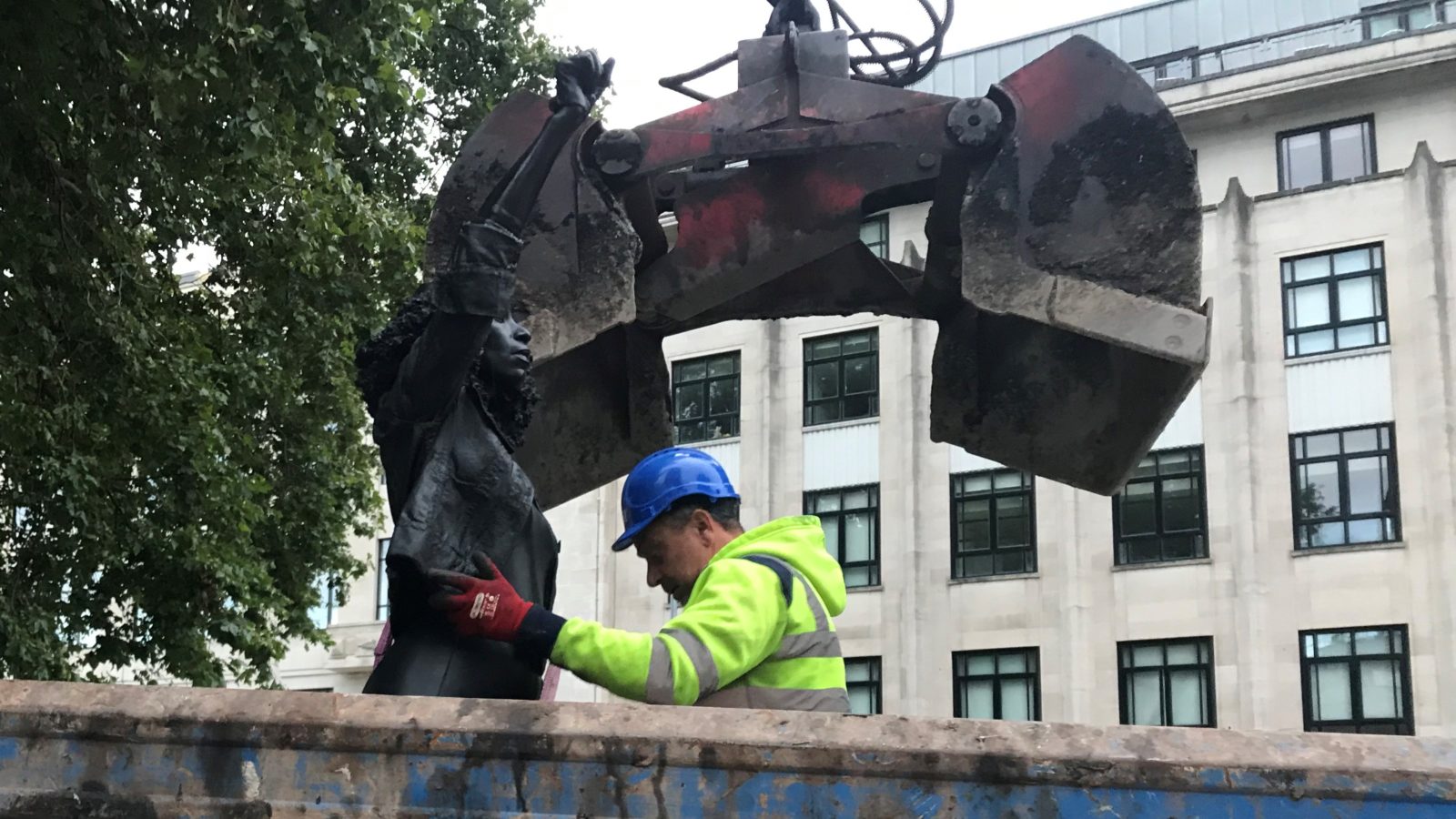 Ropes were attached to her body and the sculpture made out of black resin was lifted off the plinth onto the back of a truck.