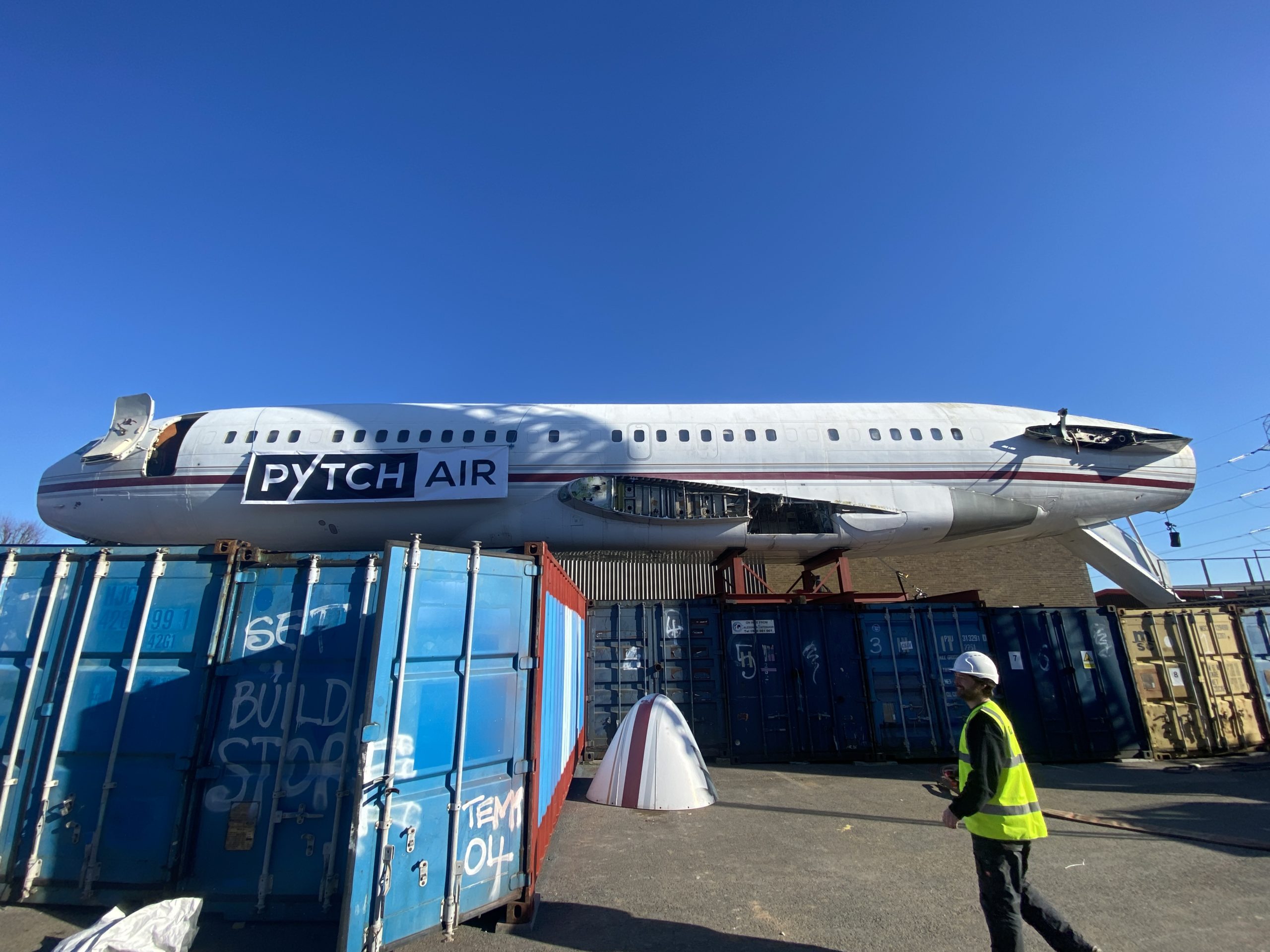On arrival, two giant cranes lifted the fuselage into position on top of a collection of shipping containers.