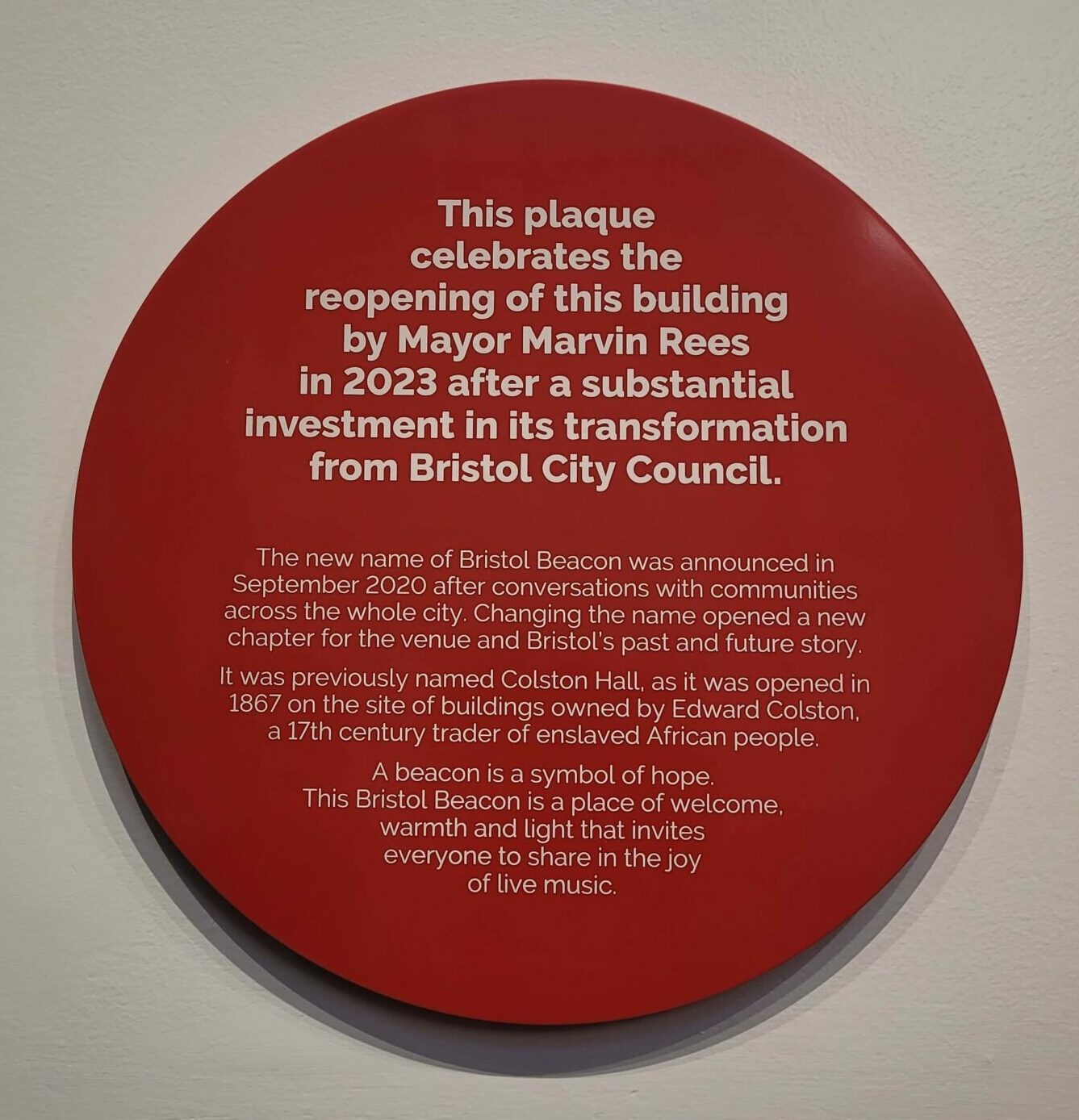 The new Bristol Beacon plaque details the journey of the venue being renamed – photo: Ellie Pipe
