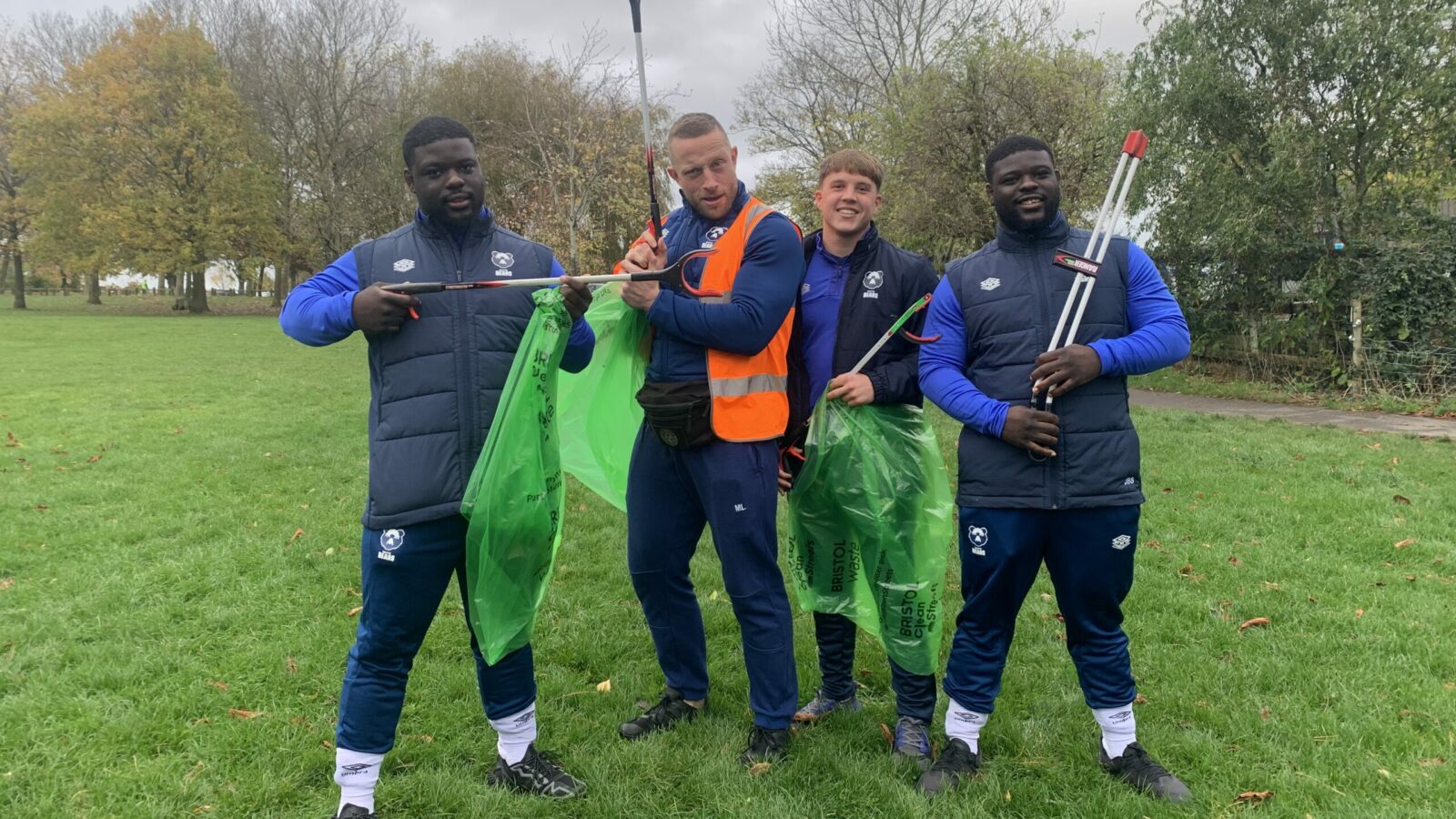Dozens of Bristol Bears players make their way around Horfield Common, sporting hi-vis jackets, and clutching bin bags and litter pickers.