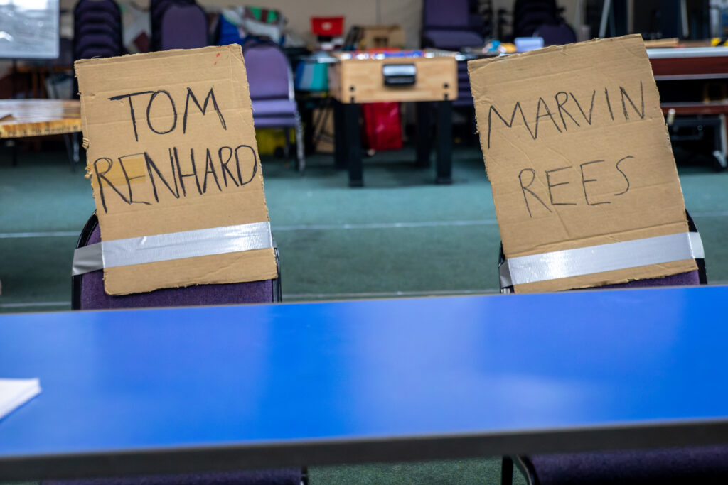 Empty chairs with Tom Renhard and Marvin Rees’ names on after they didn’t respond to an invitation to a Twinnell House meeting – photo Darren Shepherd