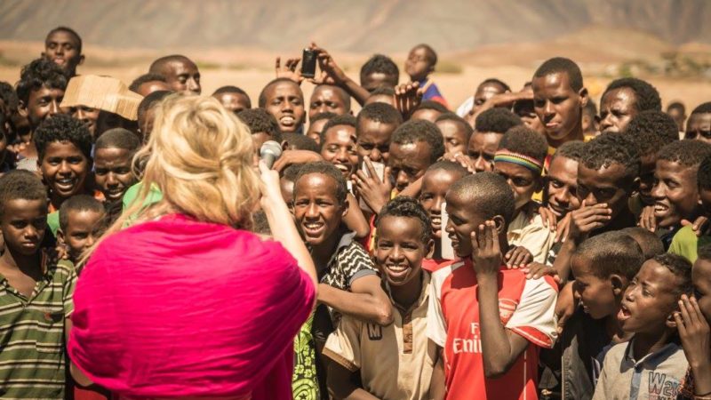 Joss Stone performing in front of young fans in a refugee camp.
