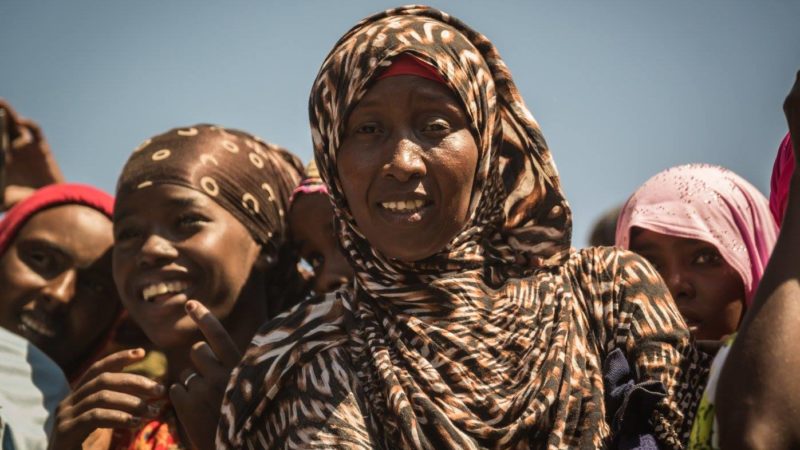 Women enjoying a moment of light relief watching a musical performance at a refugee camp in Africa