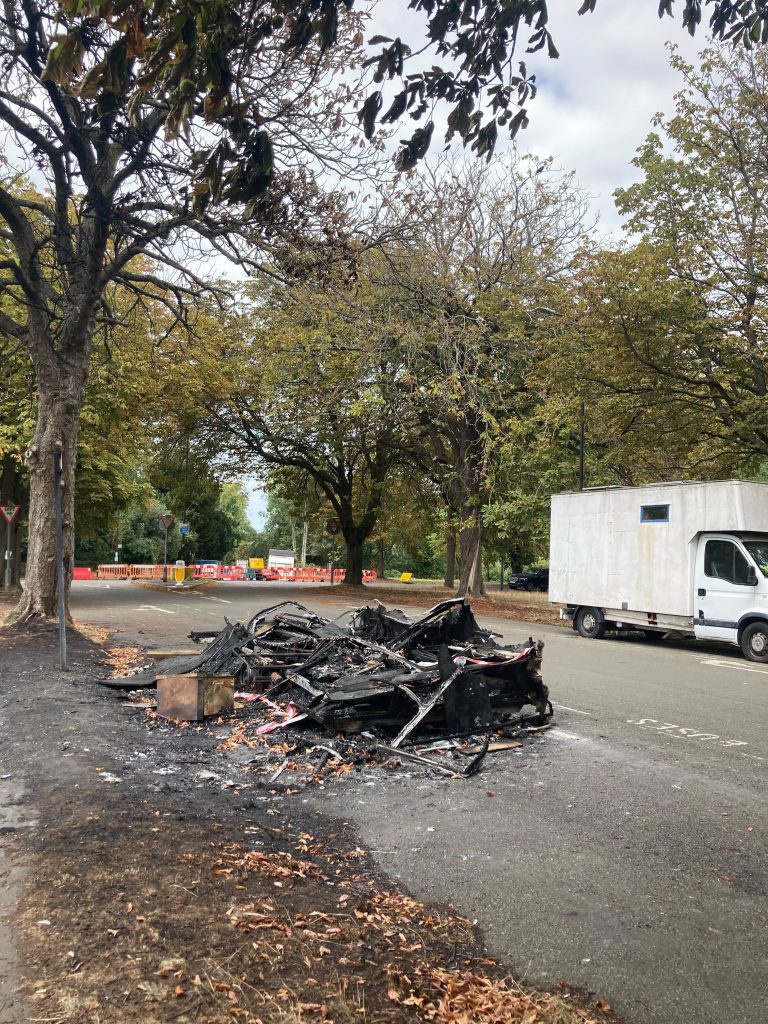 A burnt-out caravan remains on the Downs following a recent fire – photo: Rafe Llewellyn
