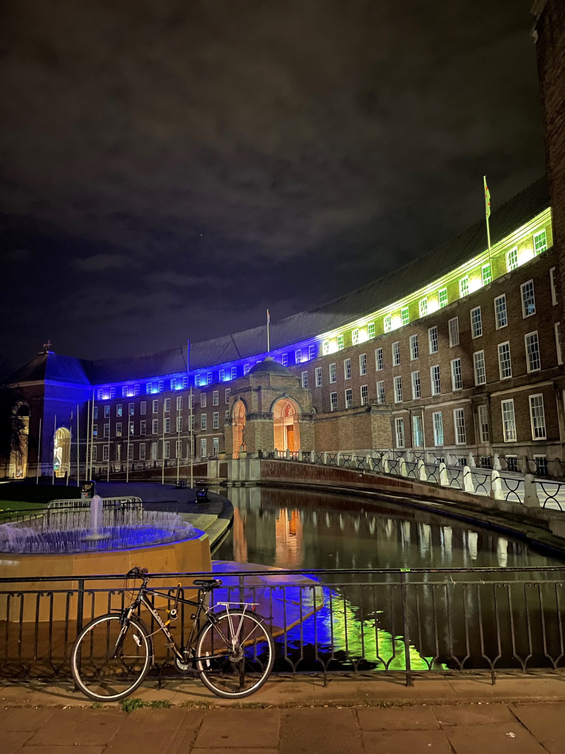 Bristol City Hall was lit in the colours of Ukraine on Sunday night – photo: Martin Booth