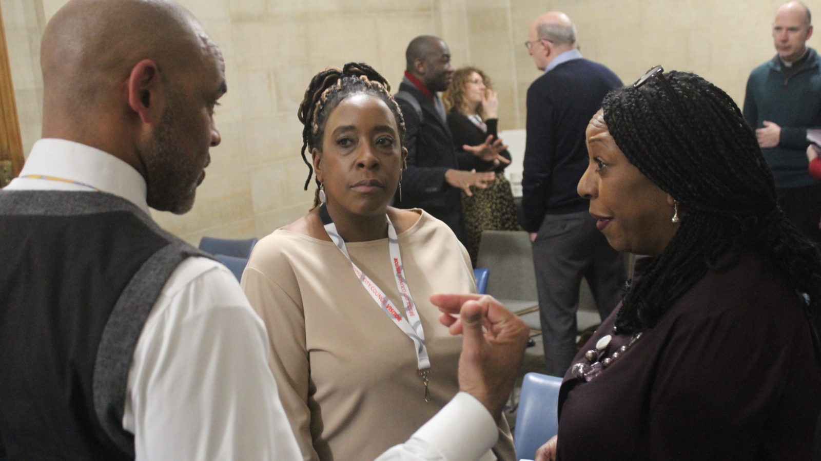 Main photo by Sally Cordwell: Marvin Rees (left) talking to Carmen Carrol (middle), who is one of the group involved in developing the manifesto, and Sandra Meadows (right), CEO of Voscur