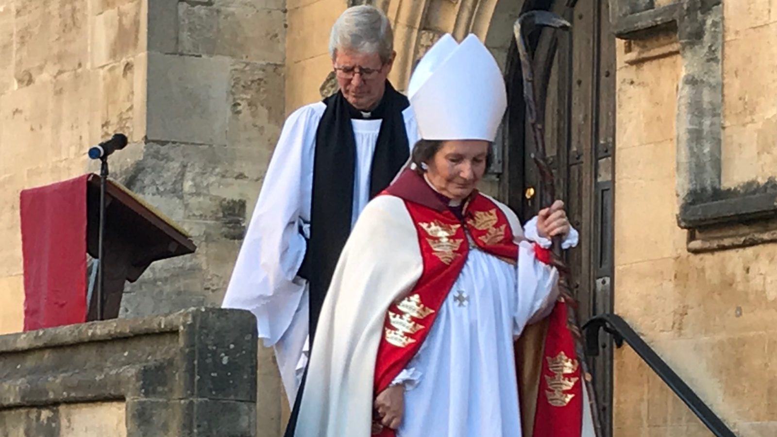 The service finished with Bishop Viv, now wearing a white bishop’s hat known as a mitre, symbolically address the people of Bristol from the steps of the cathedral gatehouse after the two City Trumpeters played a fanfare.