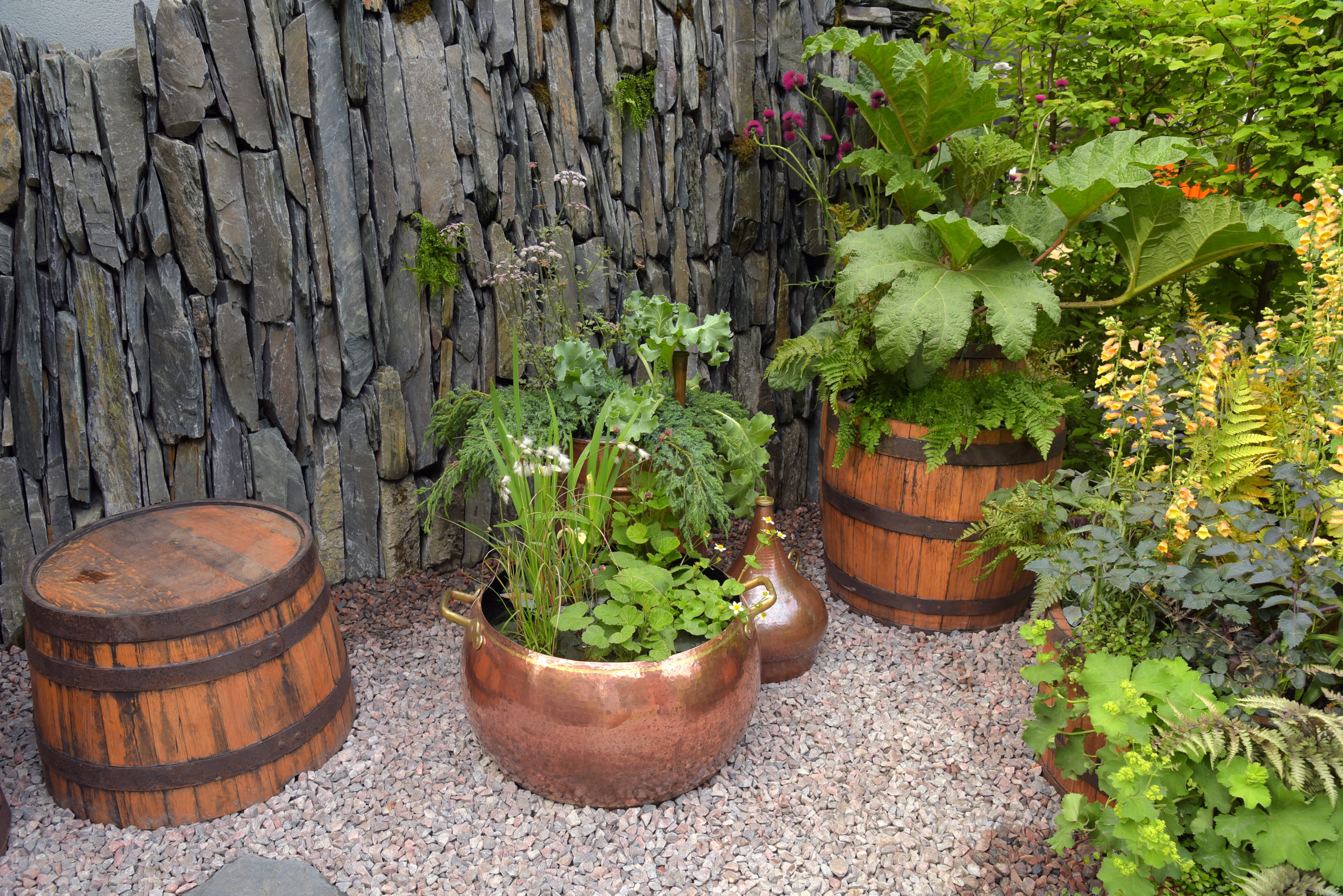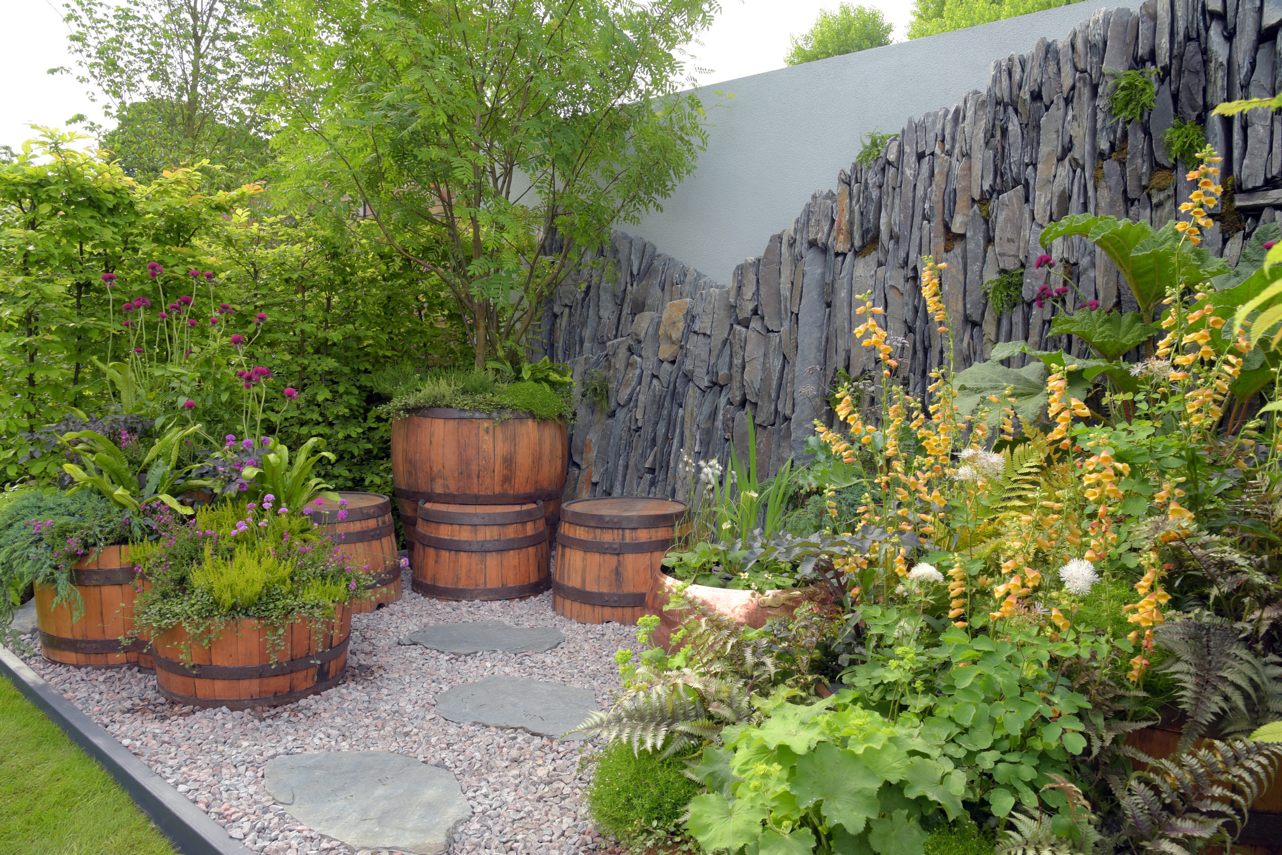 The award-winning design features plants that thrive across the Highlands and Islands in reclaimed whiskey casks transformed into planters, against a backdrop of a dry-stone slate wall constructed to look like a glen between mountains.