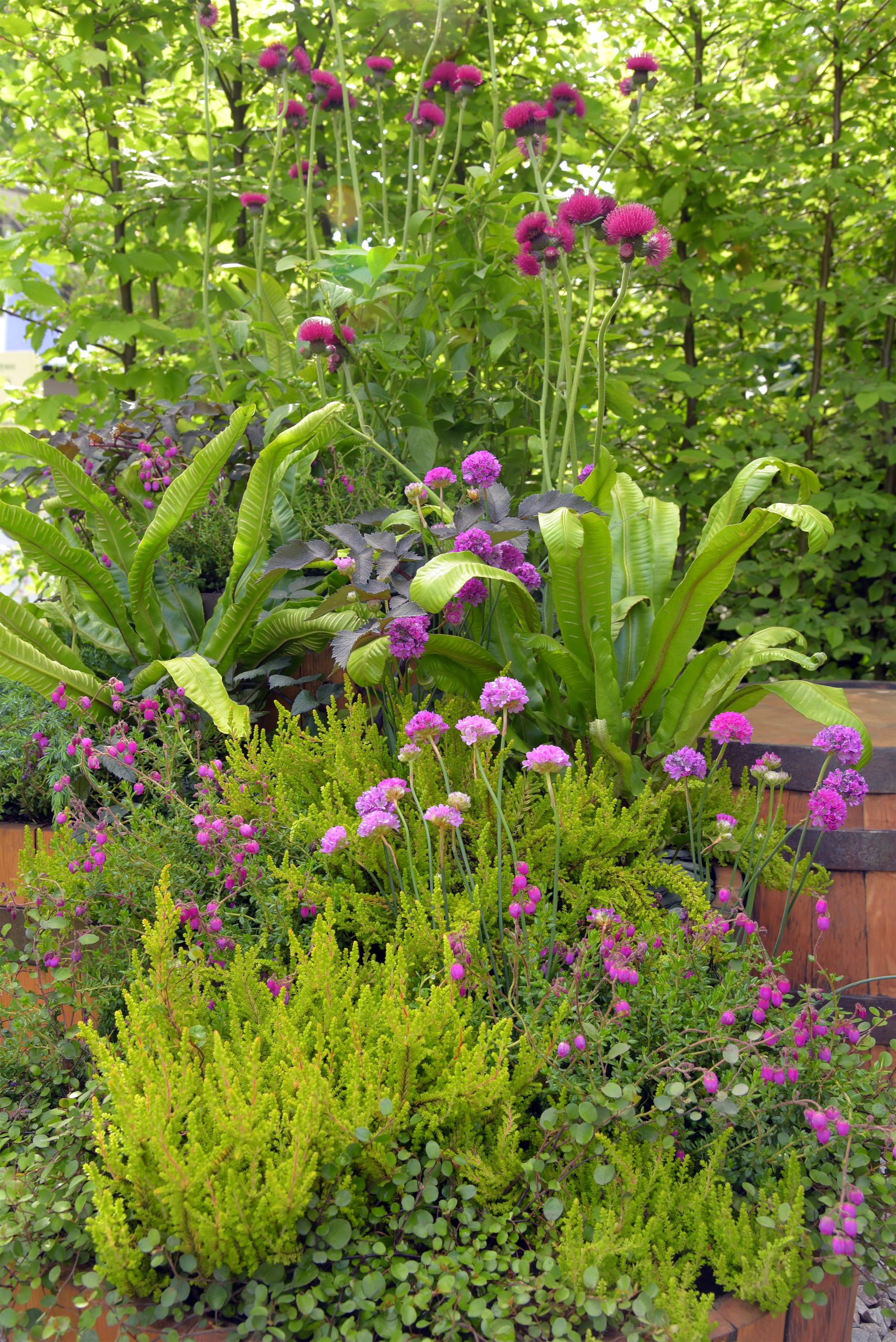 Some of the statement plants included a specimen multi-stemmed Sorbus aucuparia with frothy blossom and a Gunnera manicata – with its huge leaf forms that contrast with needle-like heathers and feathery ferns.