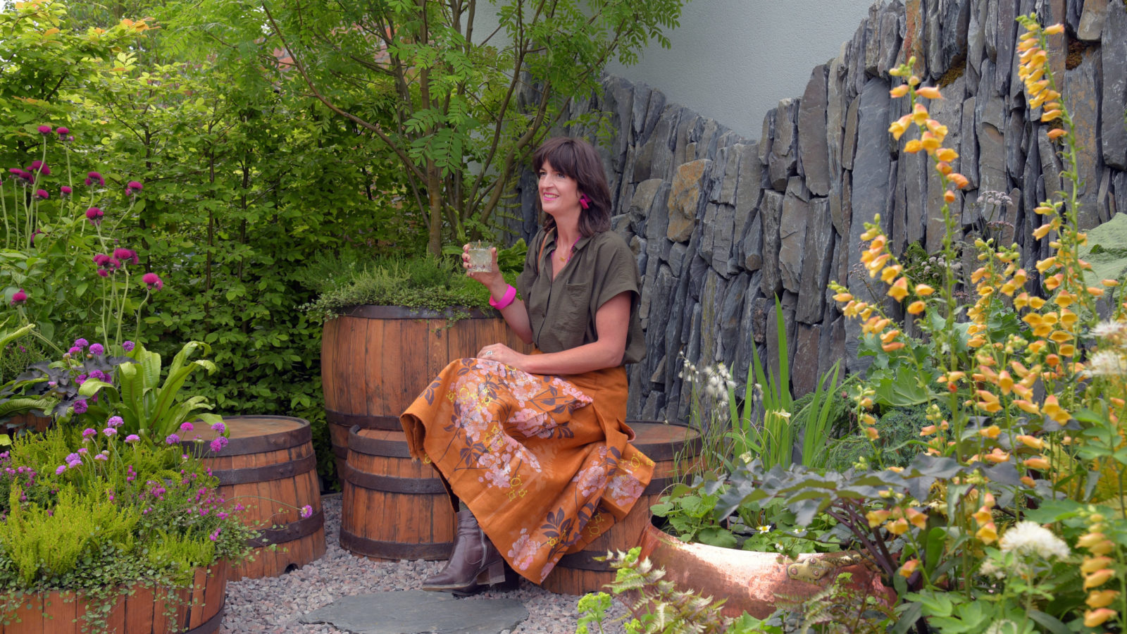 The award-winning design features plants that thrive across the Highlands and Islands in reclaimed whiskey casks transformed into planters, against a backdrop of a dry-stone slate wall constructed to look like a glen between mountains.
