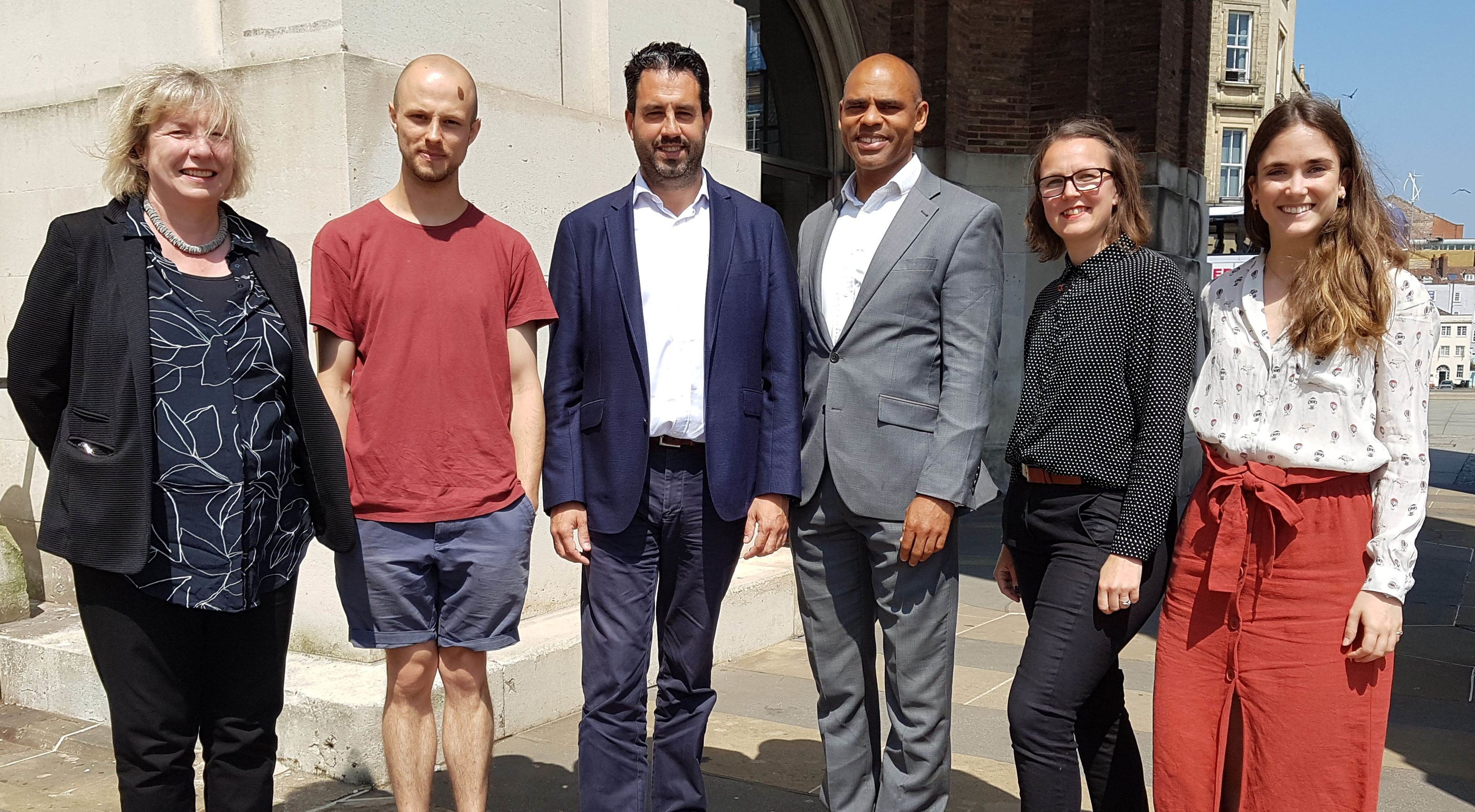 Louise Mitchell, of Bristol Music Trust, artist Brook Tate, Jordi Albareda, founder of Fair Saturday, Marvin Rees and Paloma Rodrigo, UK project manager of Fair Saturday