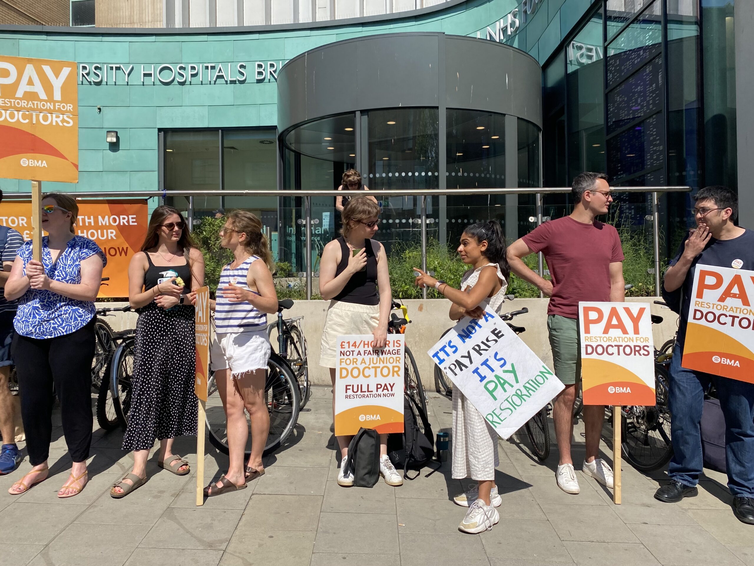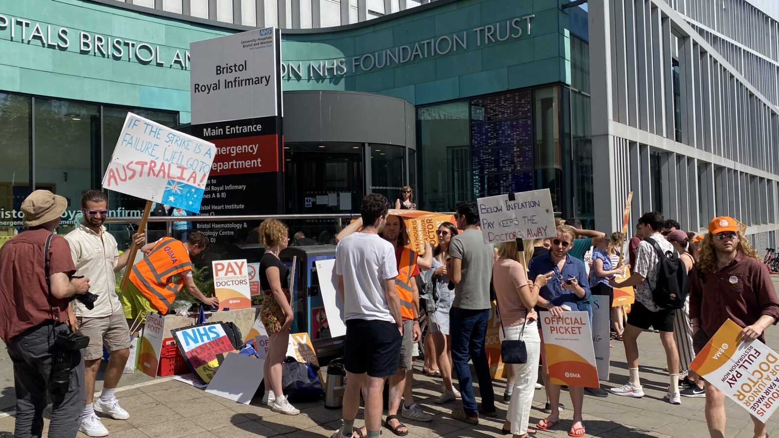 Dozens of British Medical Association (BMA) members formed a picket line outside the Bristol Royal Infirmary (BRI) on Wednesday morning, holding placards while passing motorists beeped their horns in support.