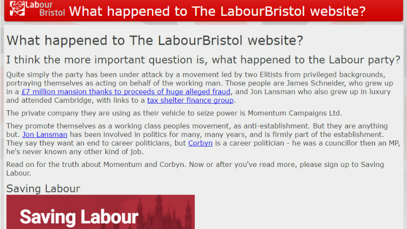 LabourBristol.org, registered to Bristolian Ben Lock in 2010, now has a long message attacking the Labour leader and Momentum, the grass-roots organisation which supports him.