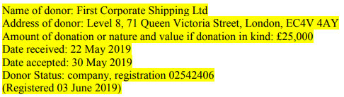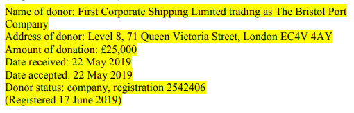 On May 22, First Corporate Shipping Ltd, who trade as The Bristol Port Company, donated £25,000 to Boris Johnson and Jeremy Hunt.