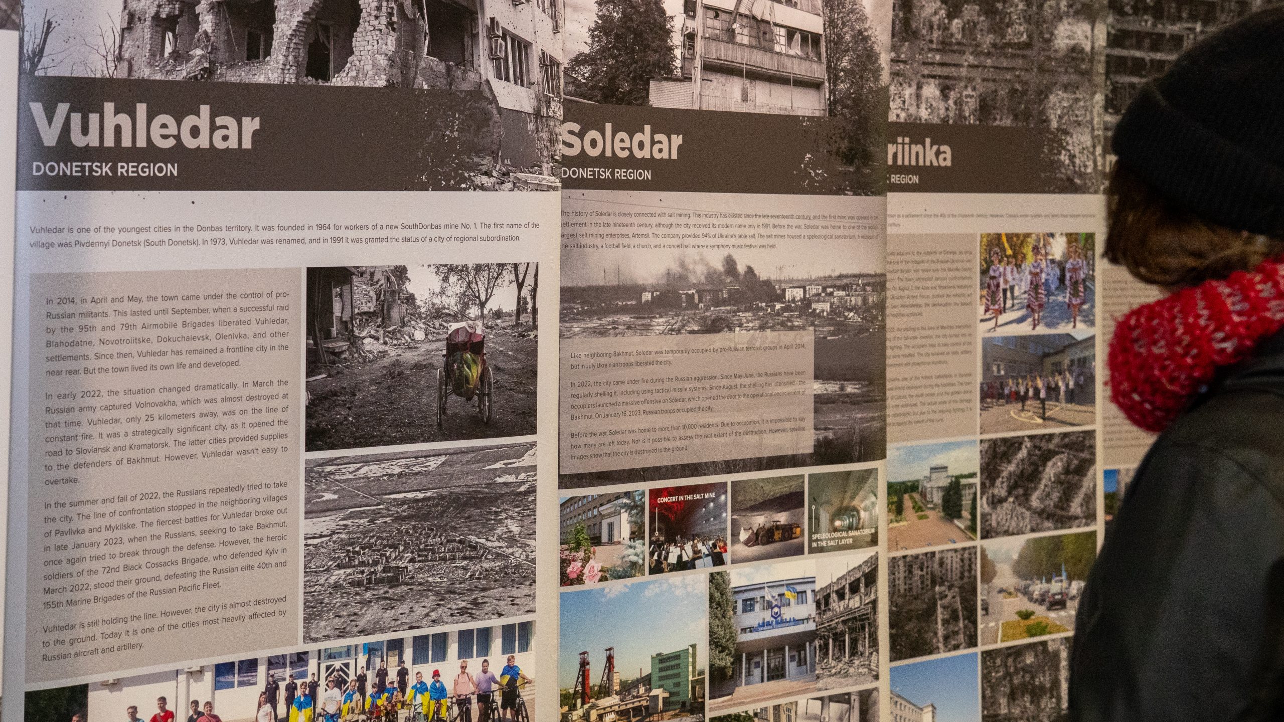 The exhibition documented the destruction of towns and villages in Luhansk, Donetsk, Sloboda, and Southern Ukraine. It also highlighted the near-total destruction of settlements such as Popasna, Maryinka, Soledar, and Bakhmut, which have been reduced to wastelands due to the Russian invasion.