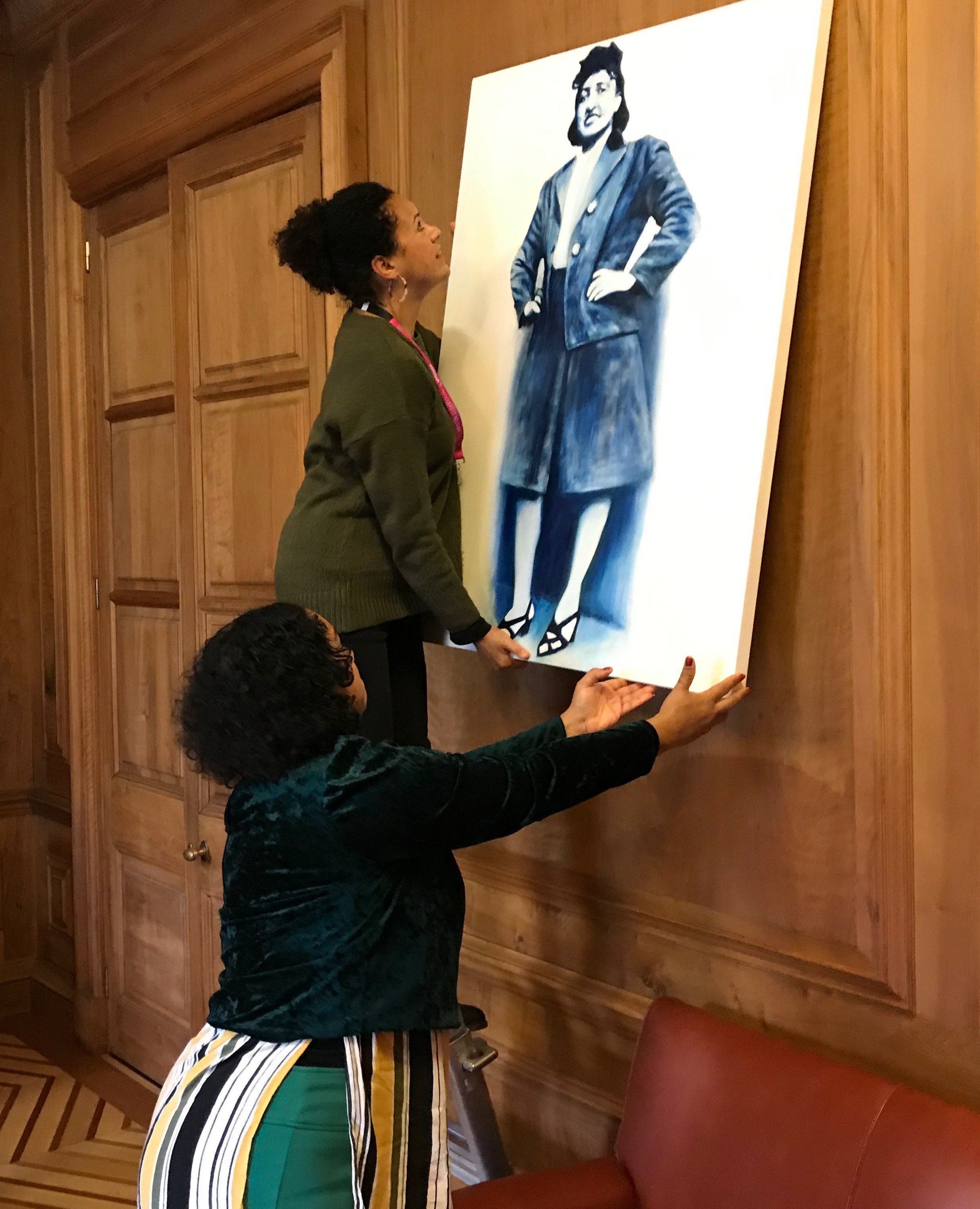 Bristol lord mayor Cleo Lake helps artist Helen Wilson-Roe hang her painting of Henrietta Lacks in the lord mayor’s parlour in 2018 – photo: Martin Booth