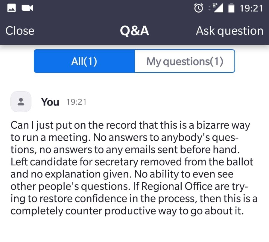 The meeting had been set up by staff working at Labour South West Regional Office after the suspensions of the Bristol West co-secretaries and chair and subsequent cancellation of the original AGM in November 2020.