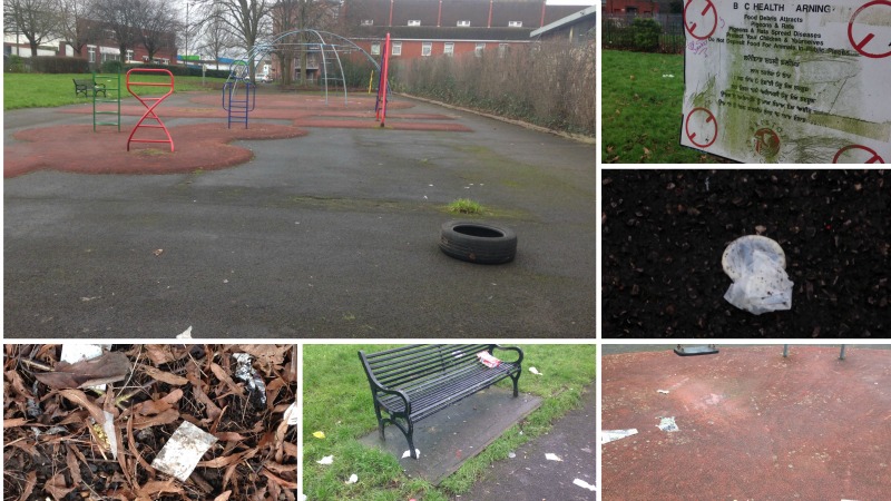She may have a point. Lying next to a bench is a used condom and drug paraphernalia. In the grass piles and piles of dog muck. By the swings a dumped tyre. Piled high in the bushes, cans and plastic bottles.