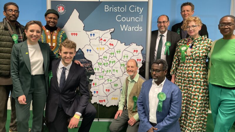 Green Party co-leader celebrates with some of the victorious Green candidates – photo: Martin Booth