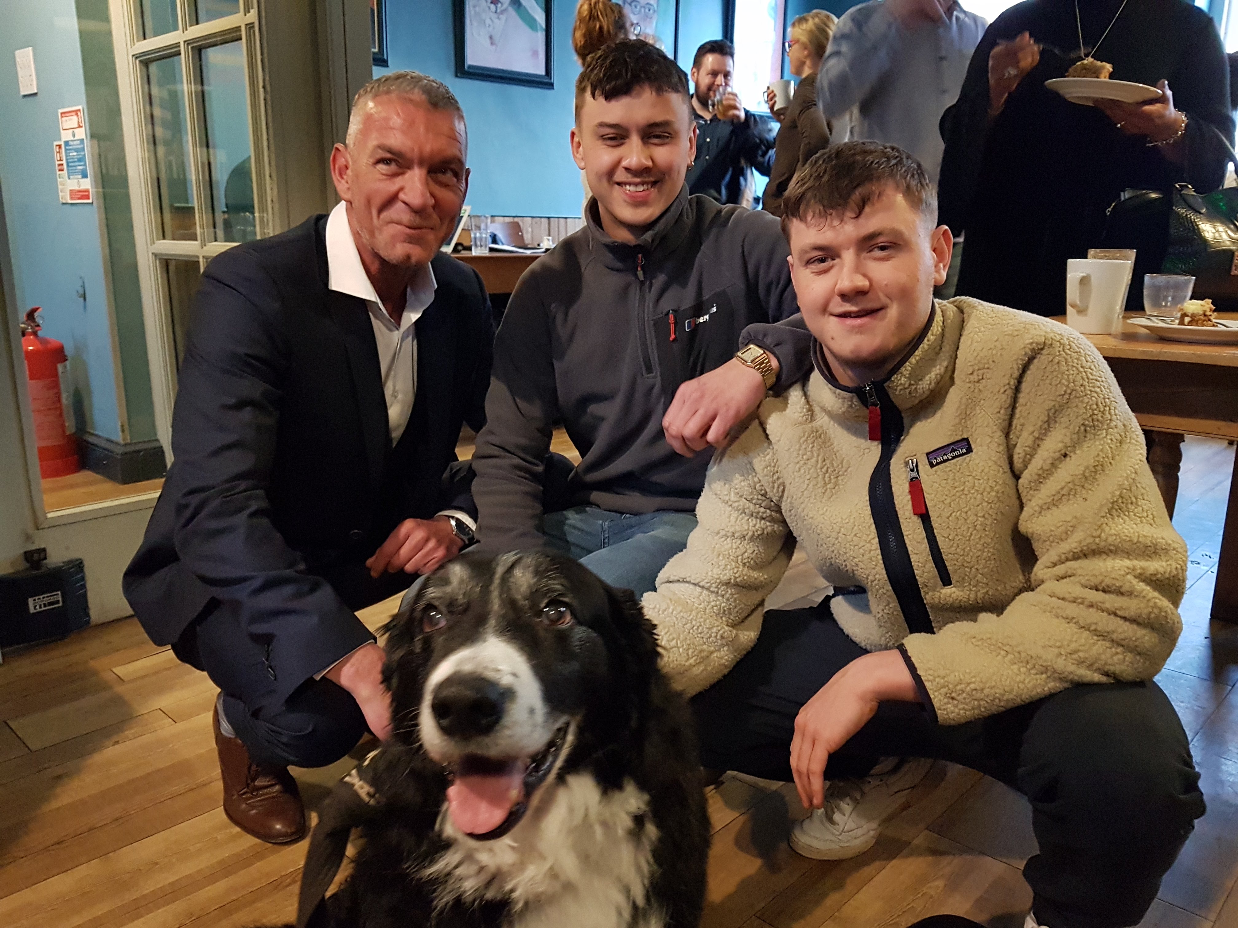 Chandos House director James Dickinson, with his sons Isaac Elliott and Josh Dickinson and the unofficial head of treatment, Bert the dog at a fundraiser in May