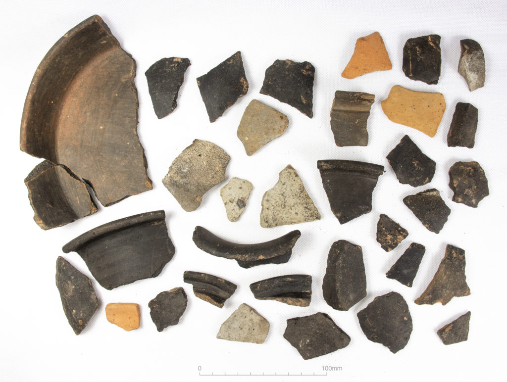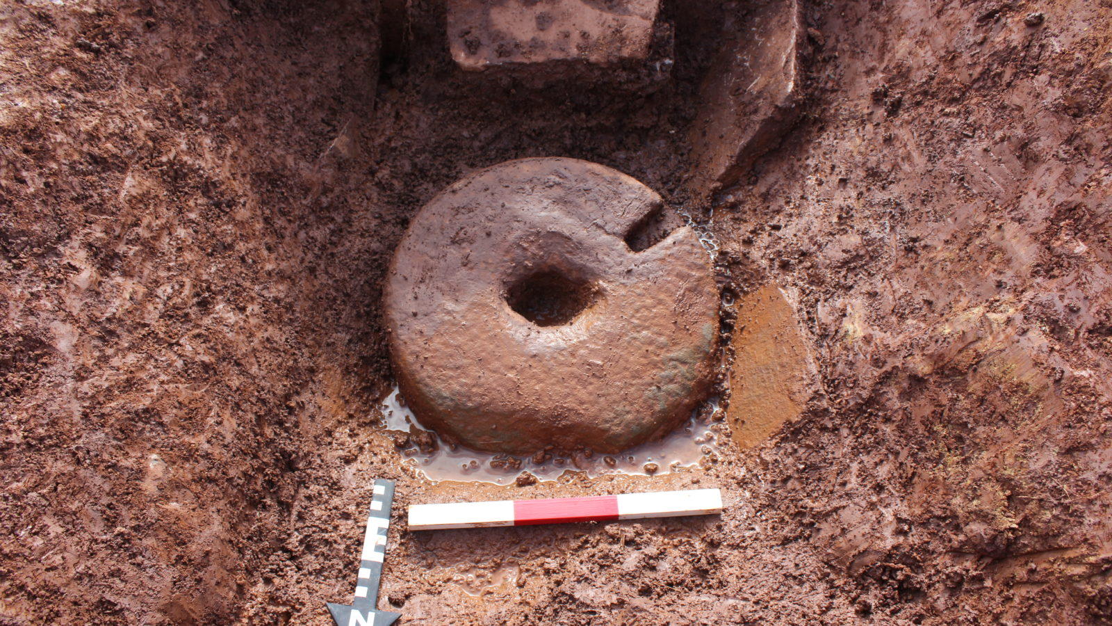 A Roman farmstead with a circular ditch that was likely a roundhouse was revealed, along with items including pottery dating from between the late Bronze Age and early Iron Age and from between the first and fourth centuries AD, and a complete quern stone (pictured above) which would have been used to grind grain into flour.