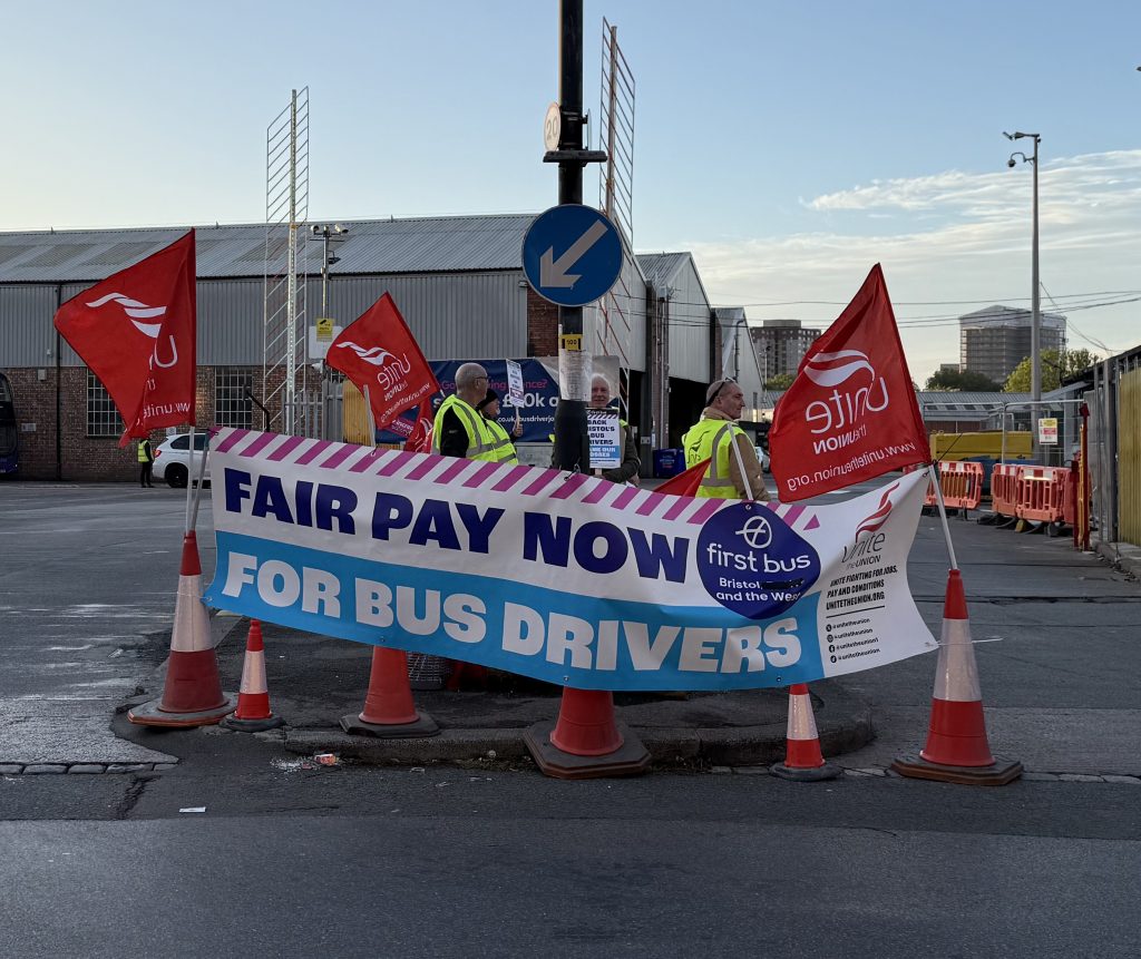 On Tuesday morning, drivers stood outside the Lawrence Hill depot, blowing whistles and holding placards with the words ‘put bus drivers not shareholders first’, ‘stop the greed’ and ‘back Bristol’s bus drivers, blame our bosses’.