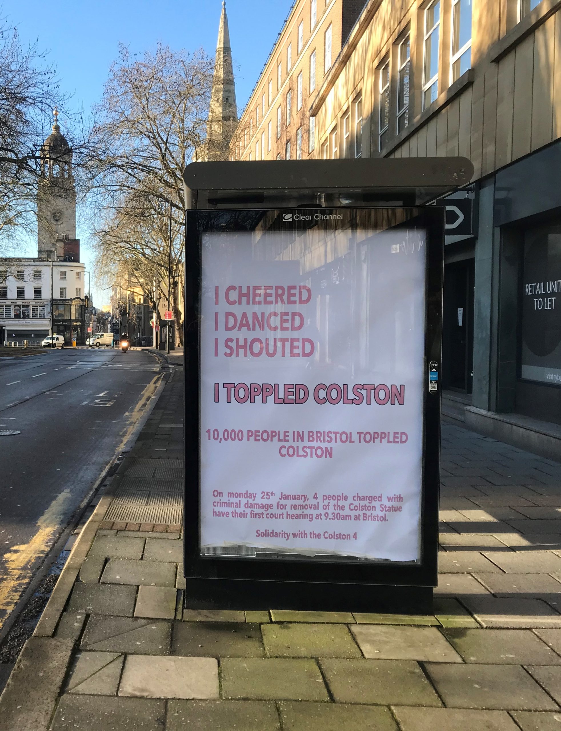 The posters say: “I cheered. I danced. I shouted. I toppled Colston. 10,000 people in Bristol toppled Colston. On Monday 25th January, 4 people charged with criminal damage for removal of the Colston Statue have their first court hearing at 9.30am at Bristol. Solidarity with the Colston 4.”