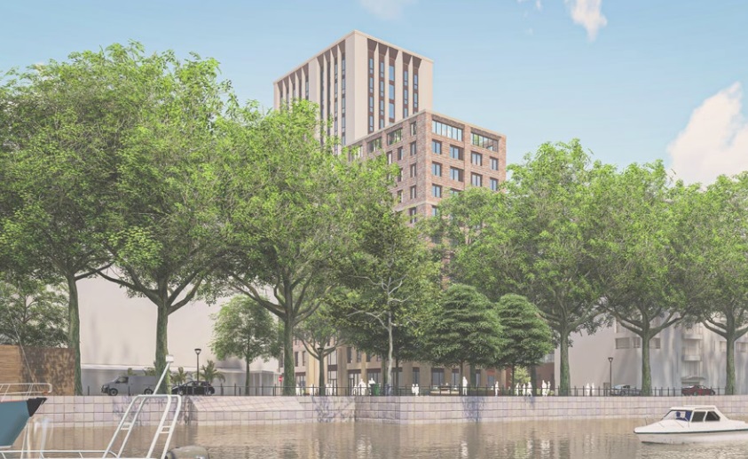 The new Waverley House as seen from the other side of the docks – image: Alec French Architects