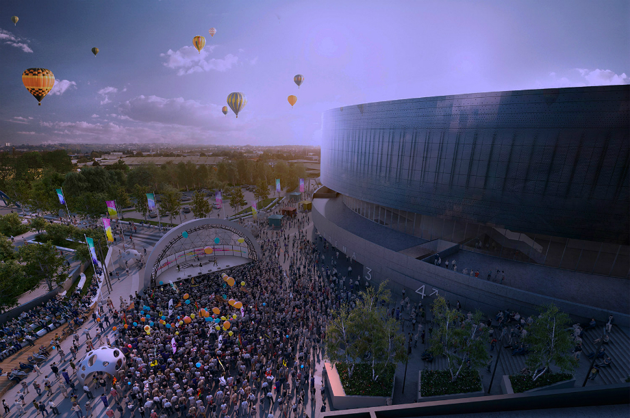 An artist’s impression of the approach for concertgoers from St Philip’s Footbridge – image: Populous Feilden Clegg Bradley