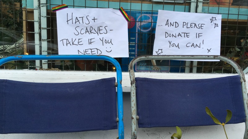 One handwritten sign above a chair outside Emmeline reads ‘Hats & scarves – take if you need’, while the second says ‘…And please donate if you can’.