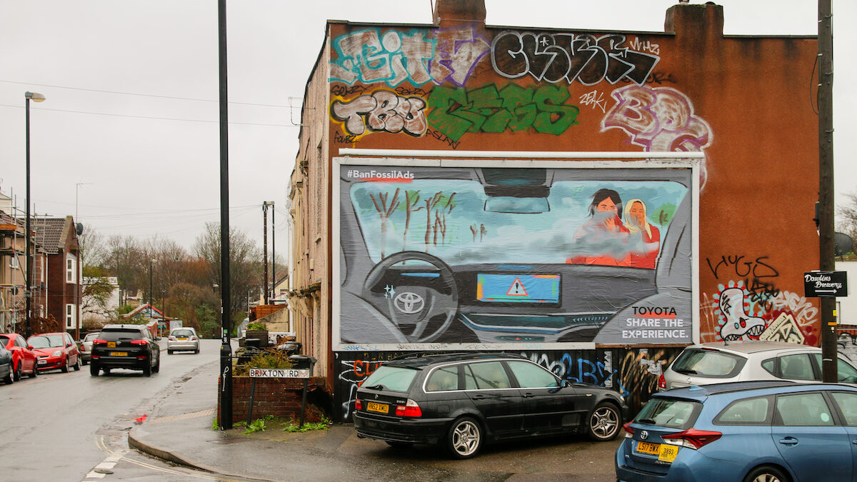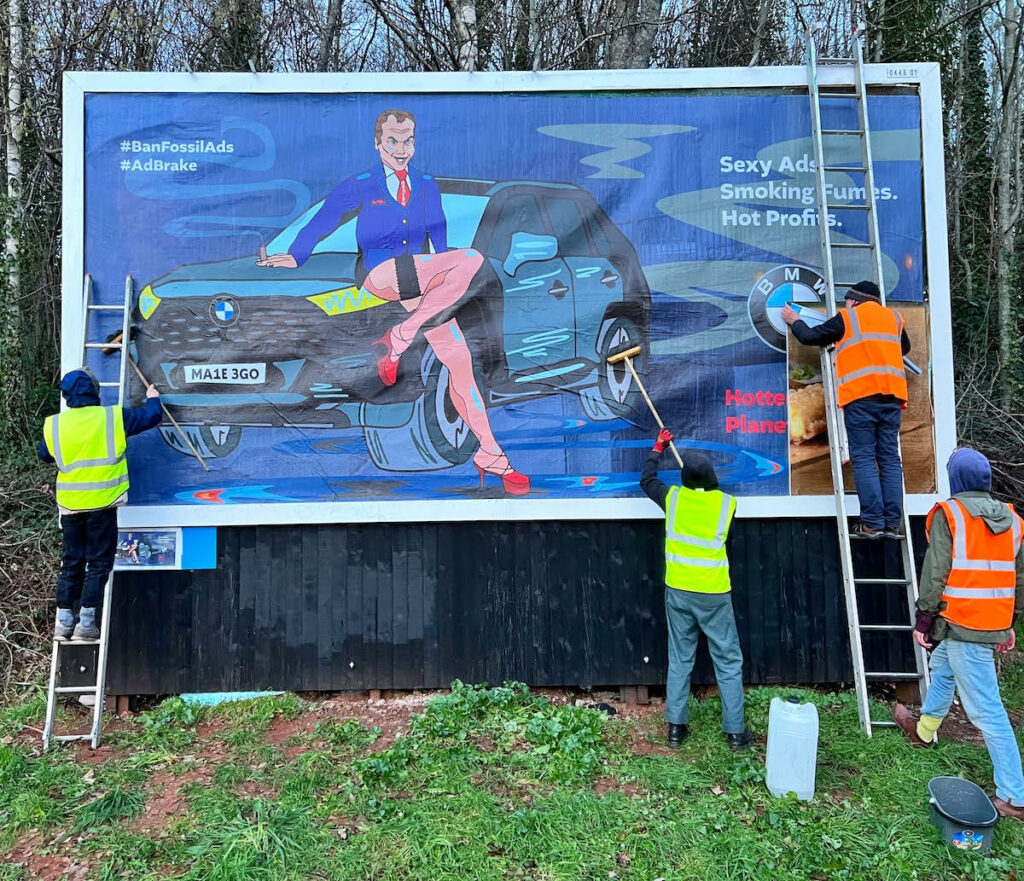 Climate activists have filled billboards sites in the city with artworks highlighting how car firms fuel the climate crisis and the role of the advertising industry in covering it up.