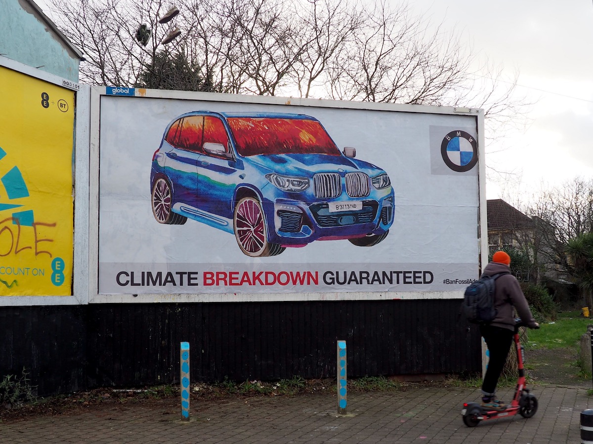 One billboard in St Werburgh’s shows a parody advert designed by Bristol artist Merny Wernz, showing a a BMW car with flames from wildfires reflected in the windscreen, above the words ‘Add Climate Breakdown’.