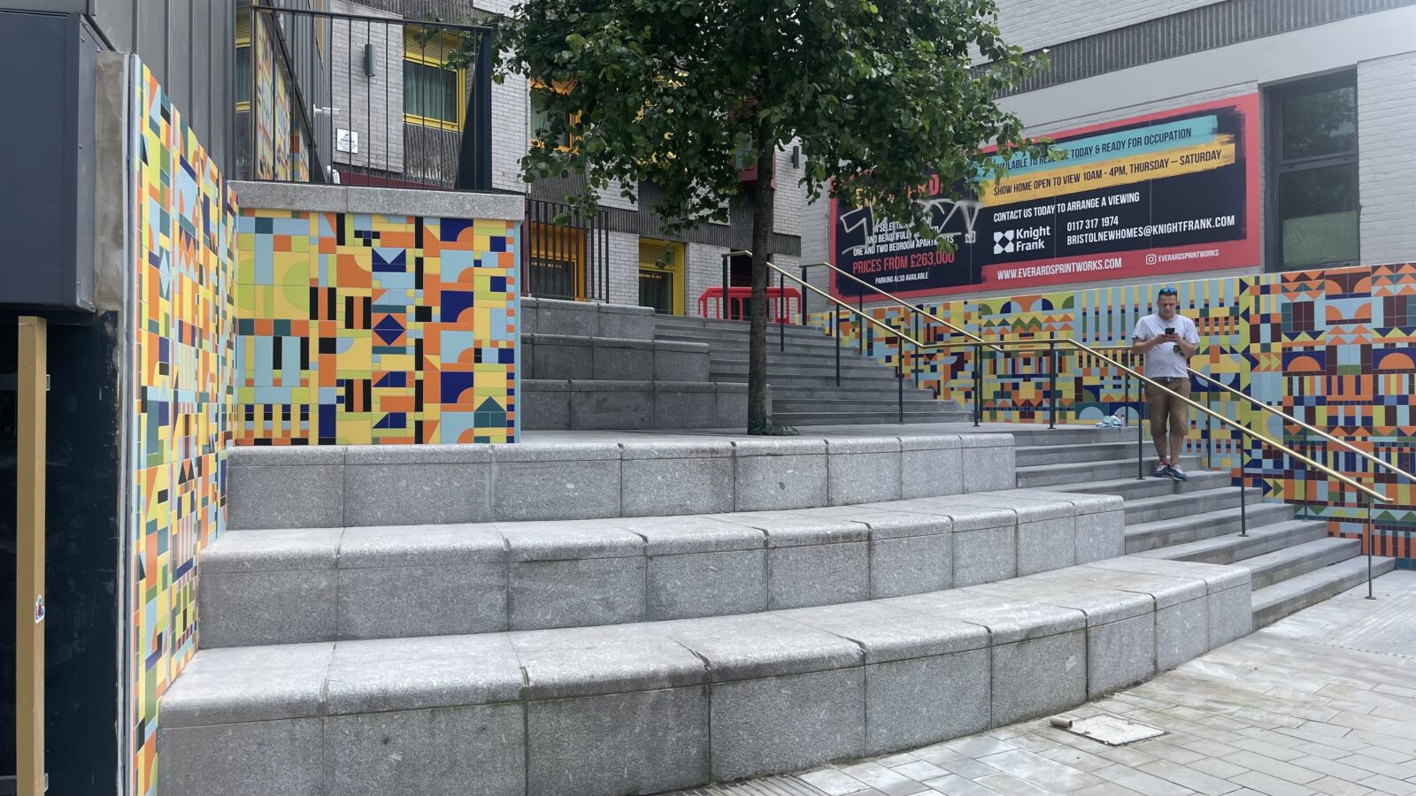 Artist Adam Nathaniel Furman has added a splash of colourful to the steps and Tower Lane with an artwork made from asymmetric tiles.
