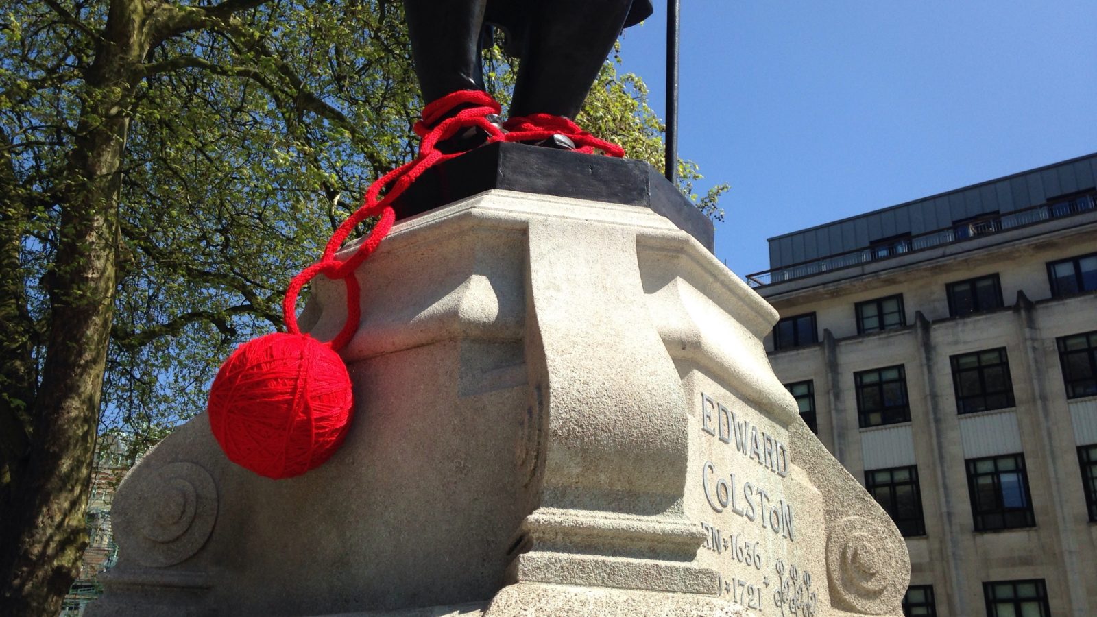 Continuing Bristol’s proud yarn-bombing tradition, the legs of the statue have now been shackled in a woolen ball and chain.