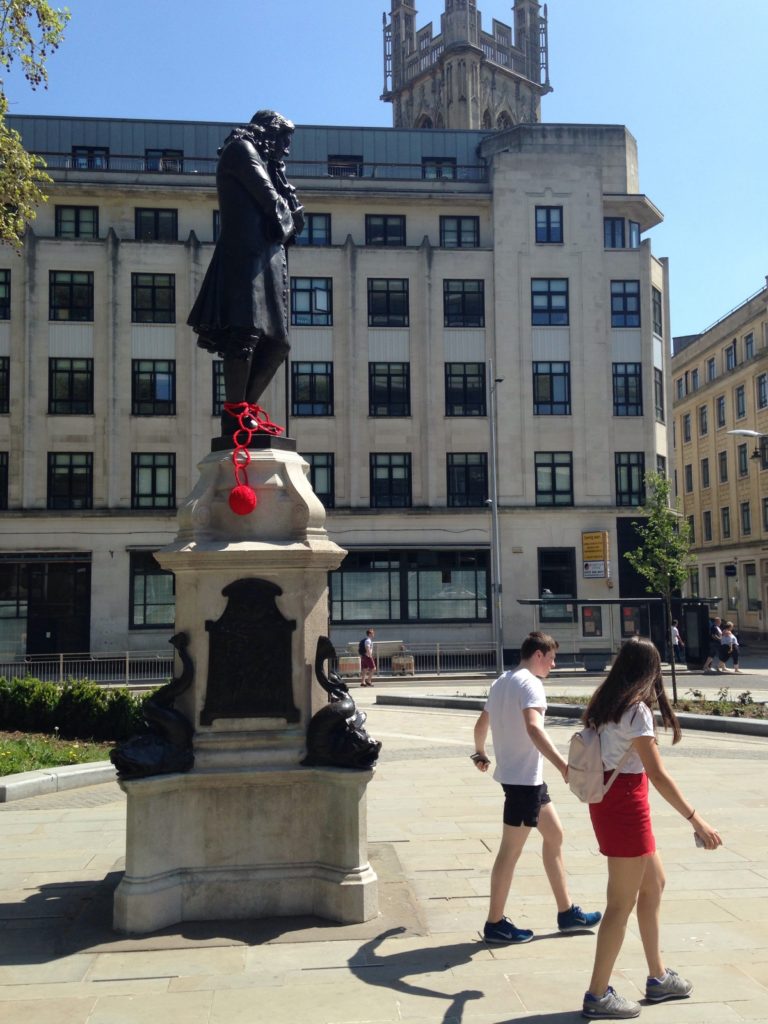Colston’s statue was given a woolen ball and chain in May – photo: Martin Booth