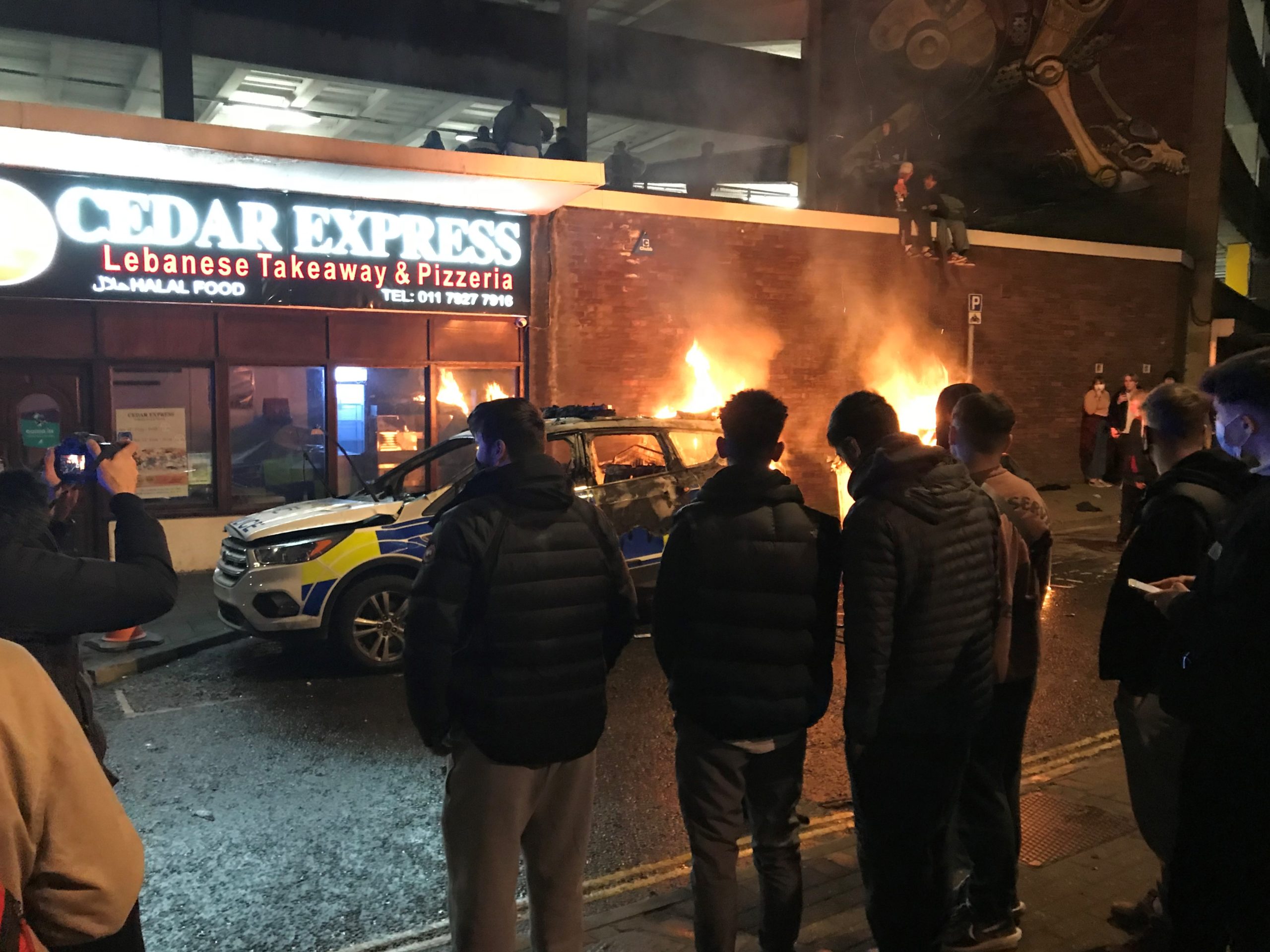 Crowds watch a police car burn on All Saints Street on March 21 – photo: Martin Booth