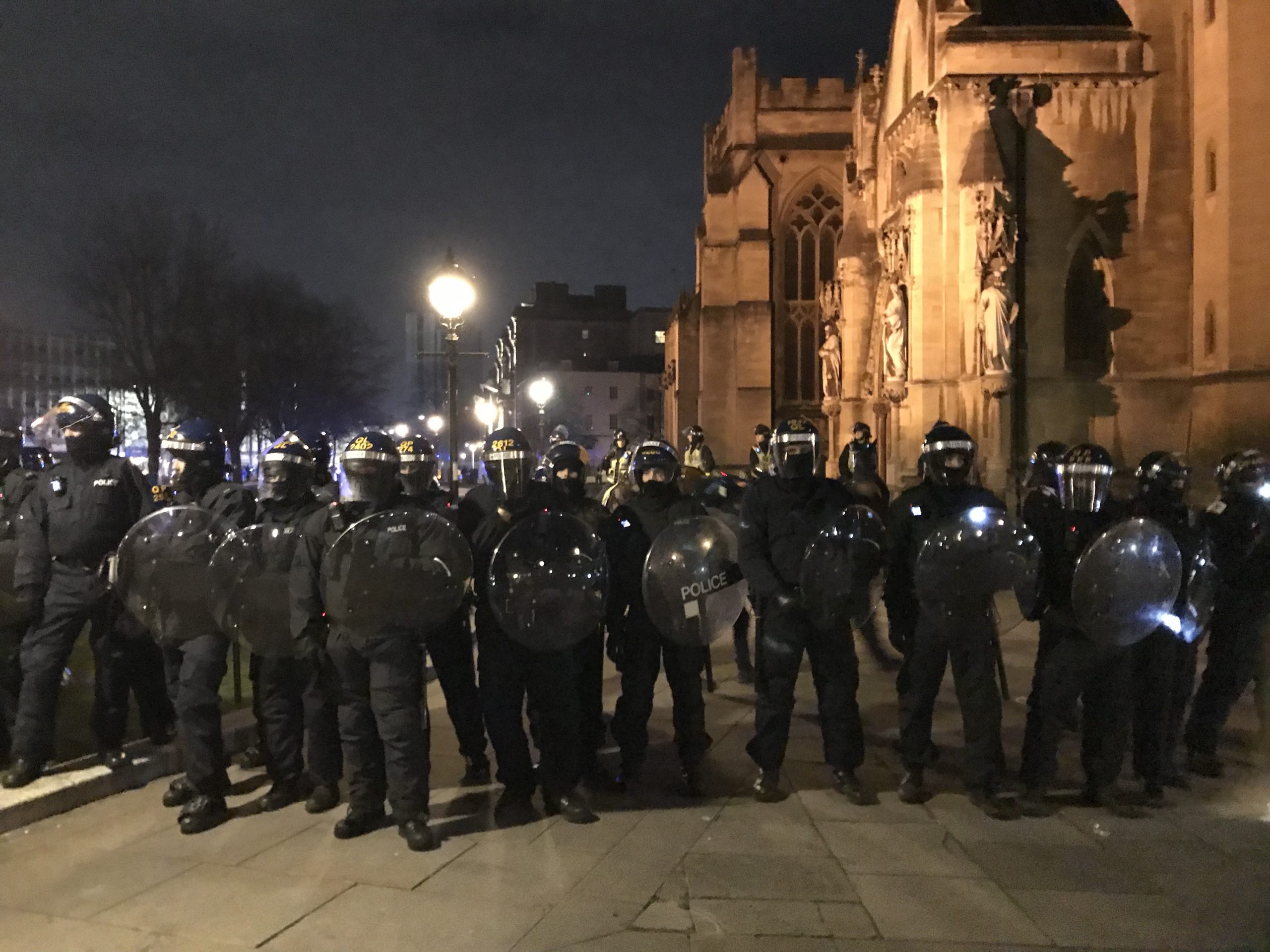 Police in front of Bristol Cathedral on the evening of March 23 after clearing peaceful protesters from College Green – photo: Martin Booth