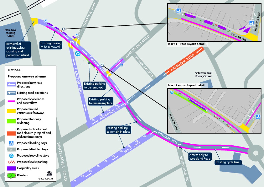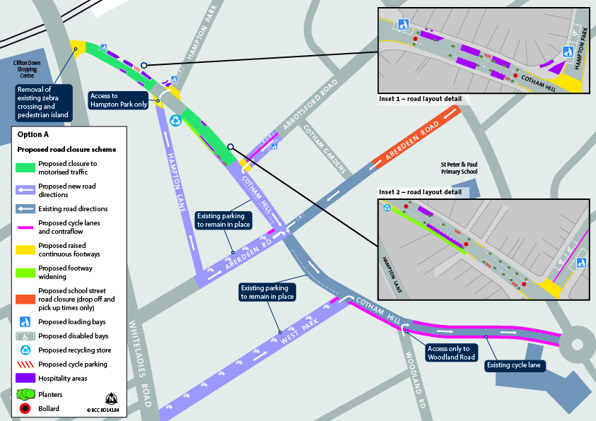 Option A: Cotham Hill pedestrianisation scheme plus improvements on surrounding roads – map: Bristol City Council