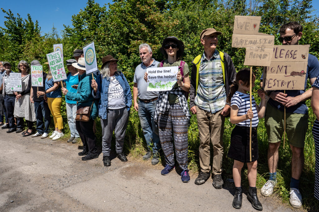 Protesters formed a human chain in front of the under-threat hedgerow at Yew Tree Farm in June 2023 – photo: Rob Browne