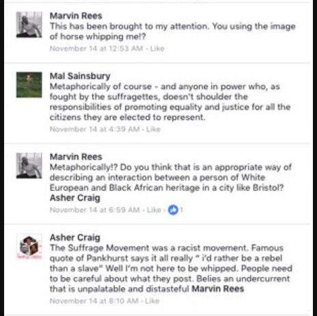 Bristol mayor Marvin Rees asked Sainsbury on Facebook: “You using the image of horse whipping me!?”, to which Sainsbury answered: “Metaphorically of course – and anyone in power who, as fought by the suffragettes, doesn’t shoulder the responsibilities of promoting equality and justice for all the citizens they are elected to represent.”