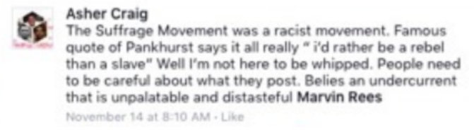 Bristol deputy mayor Asher Craig called the suffrage movement “a racist movement” in a Facebook post last year, citing the same ‘I’d rather be a rebel than a slave’ quote: