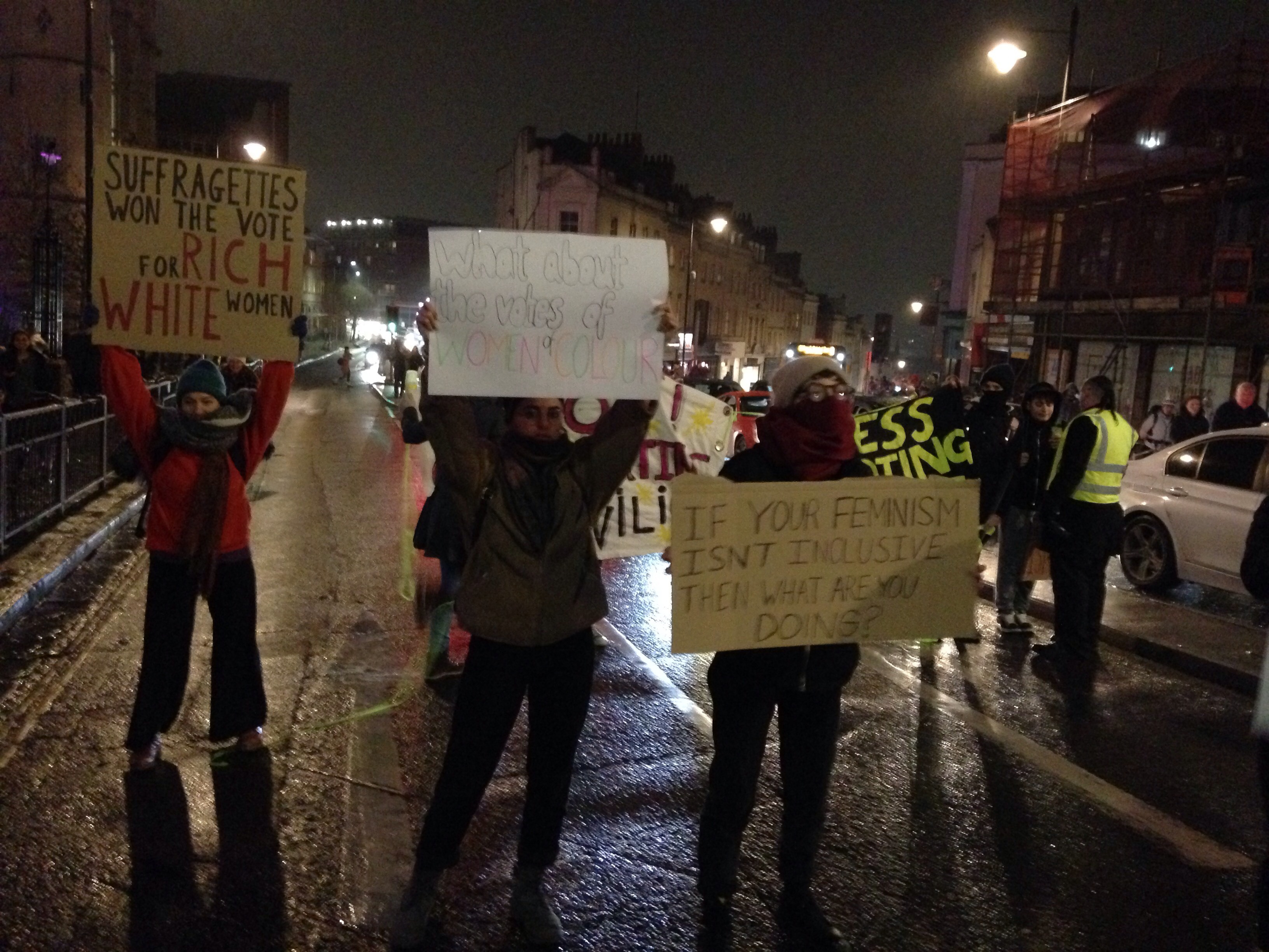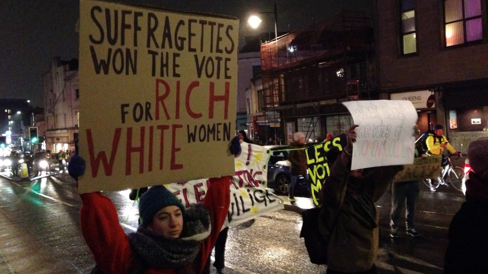 Other banners read: ‘Suffragettes won the vote for rich white women’ and ‘What about the votes of women of colour?’