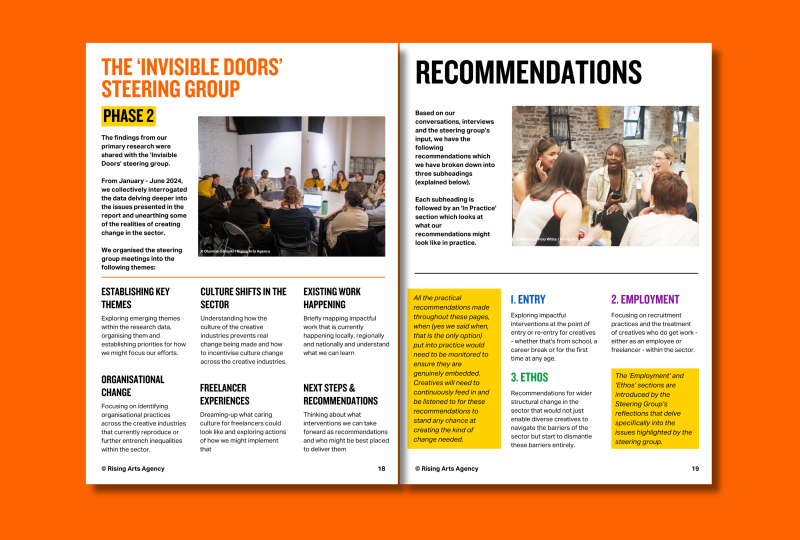 From 2023 to 2025, Rising Arts Agency built on this research, consulting with industry and convening the Invisible Doors Steering Group to create a bold set of recommendations designed to dismantle barriers into the sector and challenge the status quo: from new approaches to recruitment to radical shifts in leadership and accountability.