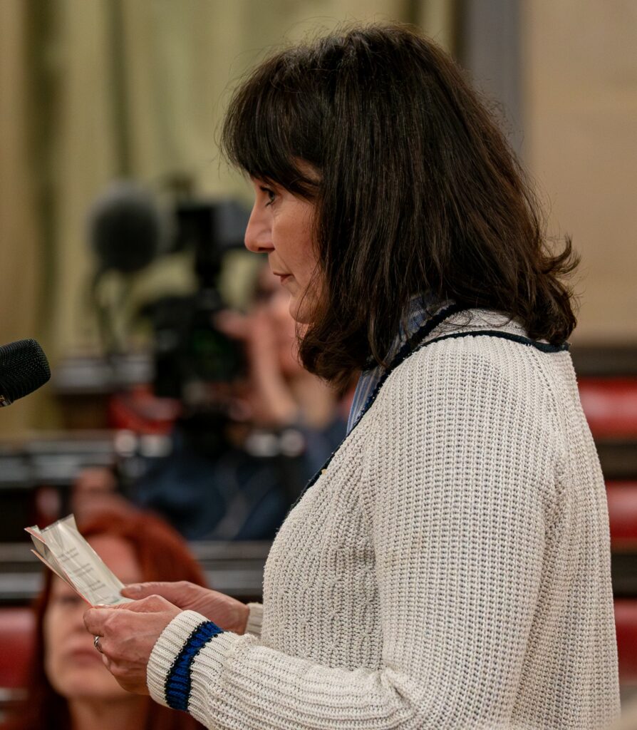 Yew Tree Farm farmer Catherine Withers speaking to councillors before they approved an application to expand South Bristol Crematorium onto a meadow used by the farm for grazing – photo: Rob Browne
