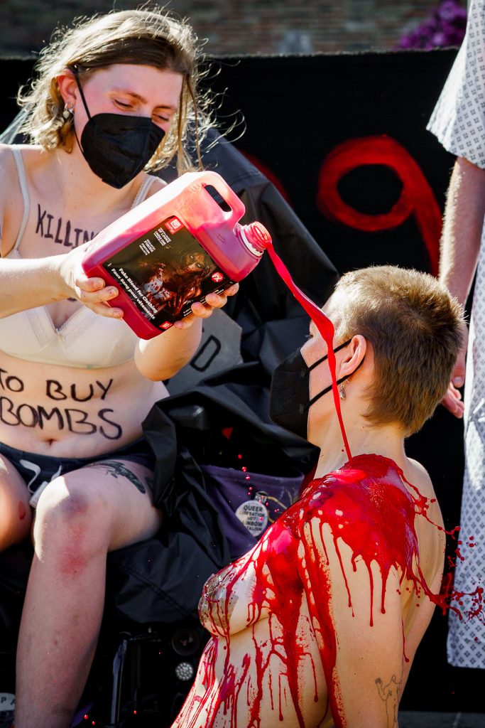 Crips Against Cuts protesters covered themselves in fake blood – photo: Jamie Bellinger