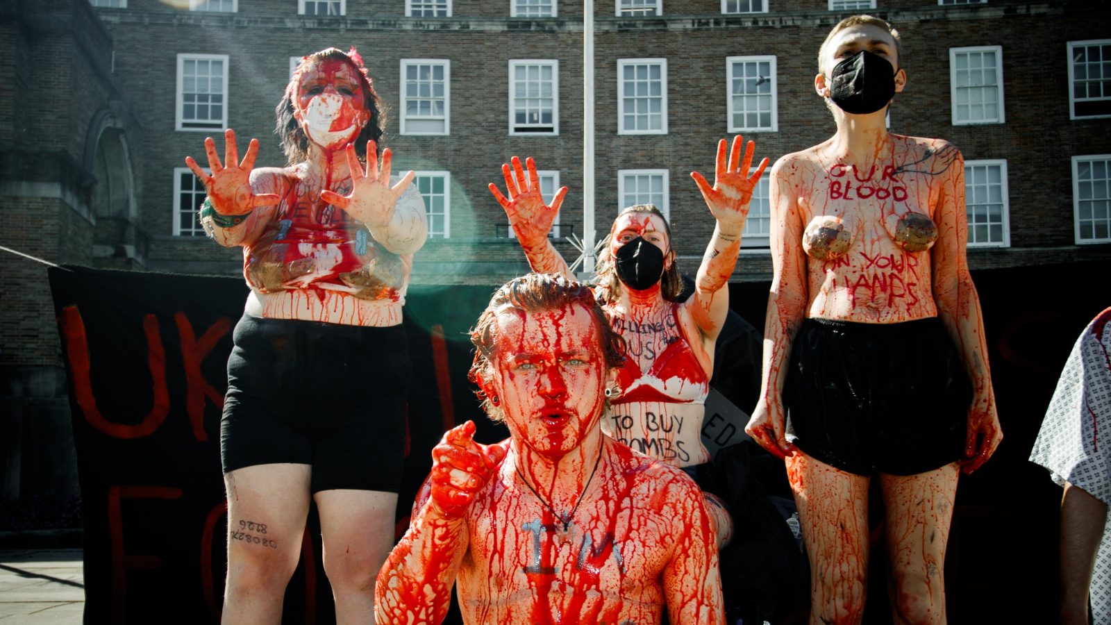Crips Against Cuts protesters covered themselves in fake blood – photo: Jamie Bellinger