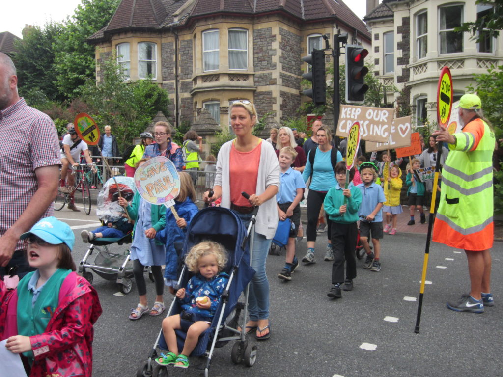 A chorus of beeps from motorists rang out in support as children and parents took to the streets in Totterdown to protest against plans to cut school crossing patrols.