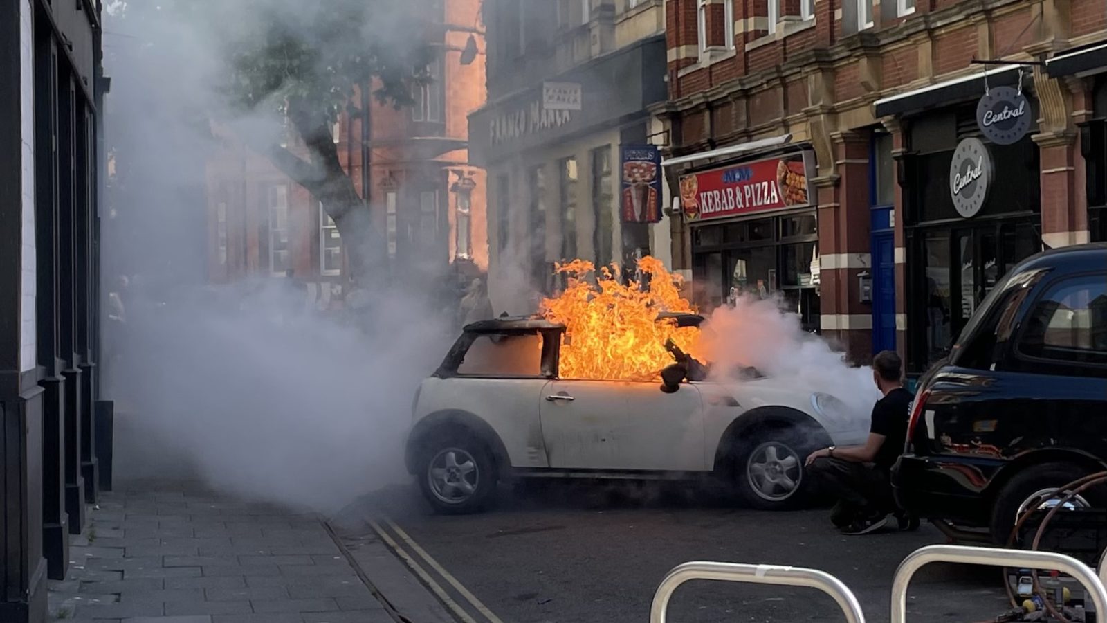 Smoke drifted over the Old City as a Mini was set alight on Marsh Street, with curious onlookers getting a glimpse of events unfolding from behind barriers on Baldwin Street.